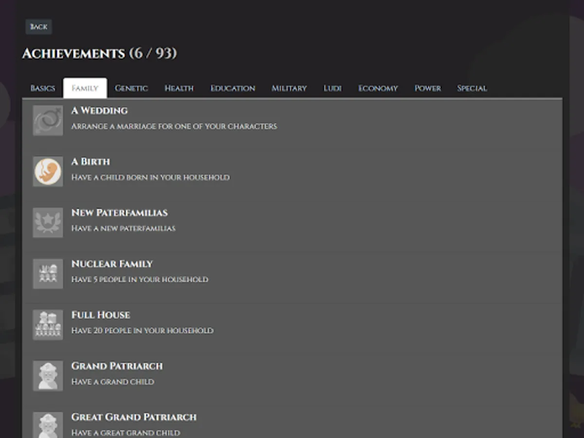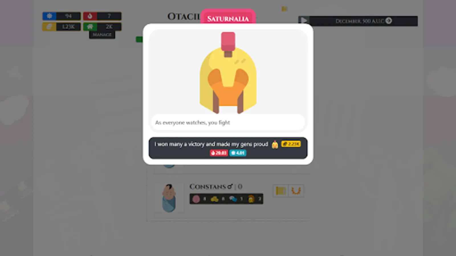 The game is open-ended without a set endgame just like in real life, but a grand goal for any ambitious Roman family was to land a Consulship of the republic. This could be your goal in the game as well, climbing the Cursus Honorum and becoming a "New Man" - "Novus Homo"