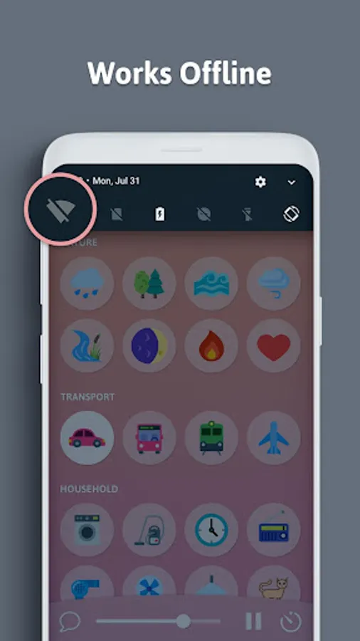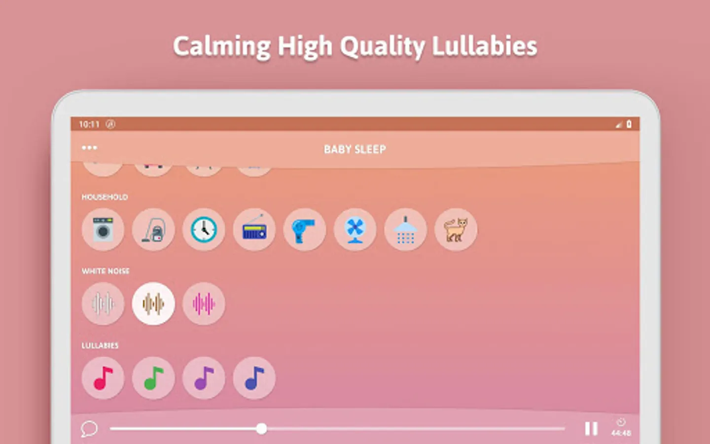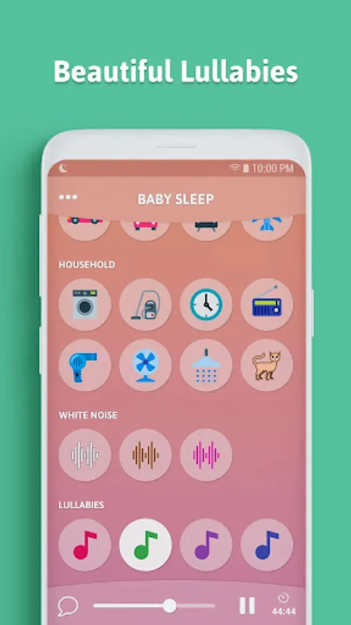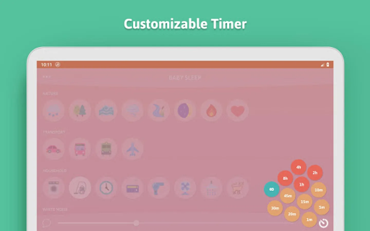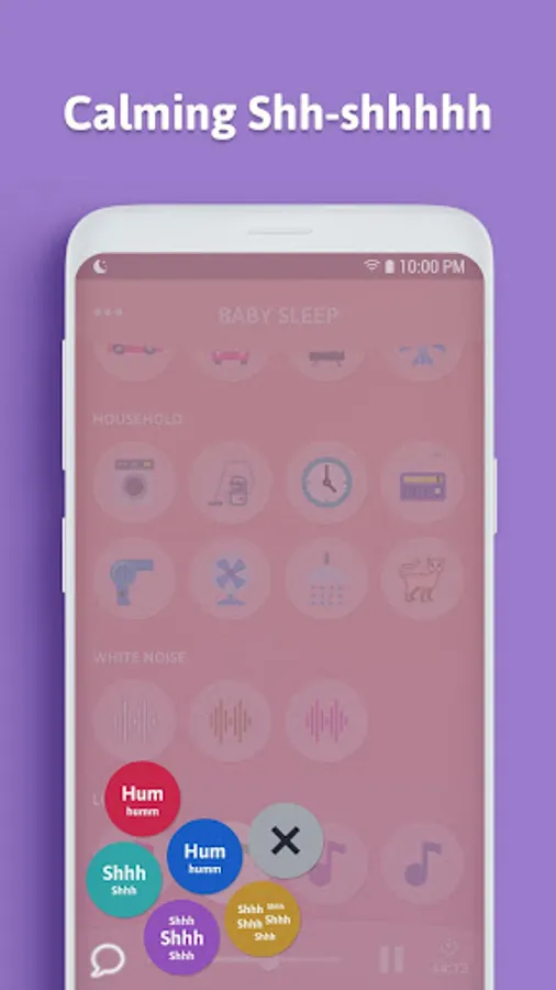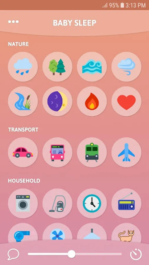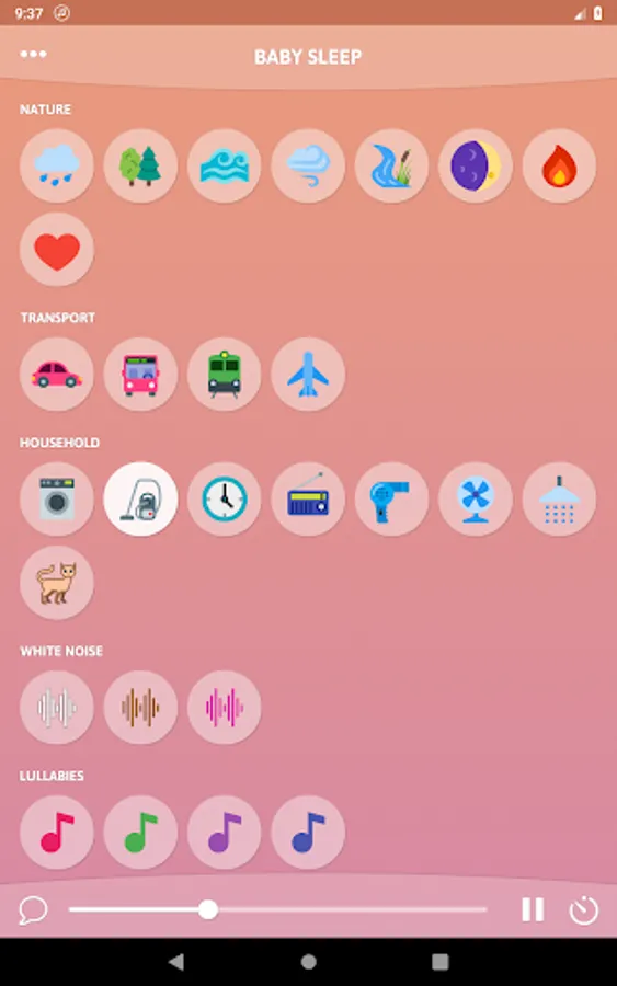 ★ Rain ★ Forest ★ Ocean ★ Wind ★ River ★ Night ★ Fire ★ Heart ★ Car ★ Train ★ Plane ★ Washing machine ★ Vacuum cleaner ★ Clock ★ Fan ★ Radio ★ Hair dryer ★ Shower ★ White Noise ★ Brown Noise ★ Pink Noise ★ 4 gentle lullabies
