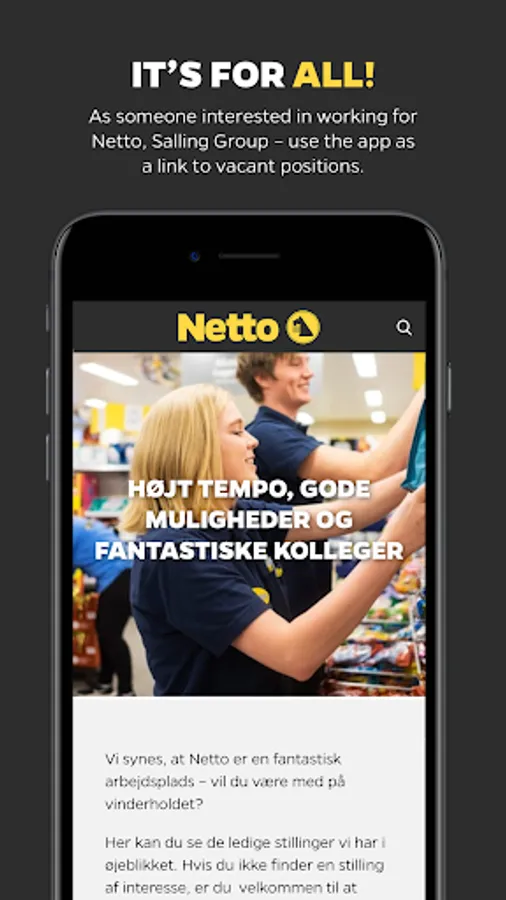 This app is for Net, Salling Group employees and for those interested in a job with Net. As an employee, stay updated on what's going on in your store and do not miss out on Net News. Stay in touch with your collages and share success stories across stores. Do it all on your mobile and be ready for your next shift. As someone interested in working for Net, Salling Group - use the app as a link to vacant positions.