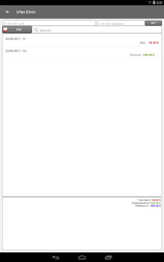 You can see the total payments and debts that can list payments and debts at the desired date range.