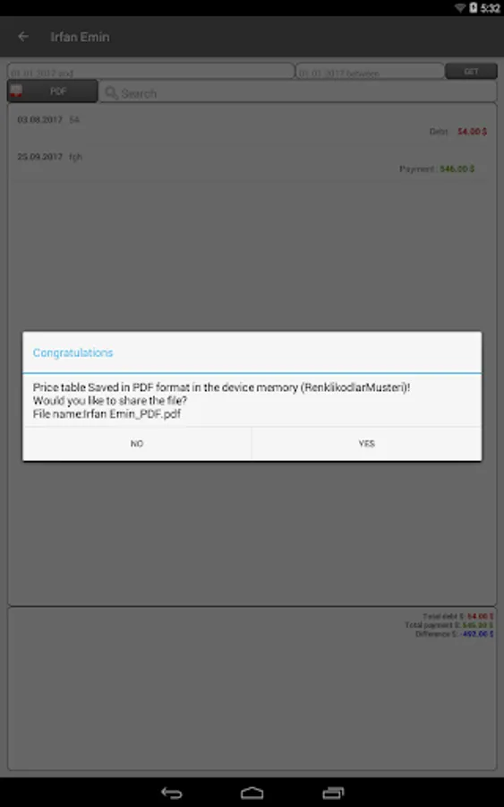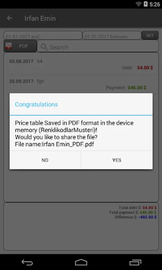You can share the payment and debt sheet of the quote in PDF format. You can share the PDF file with your customers via instant mail.