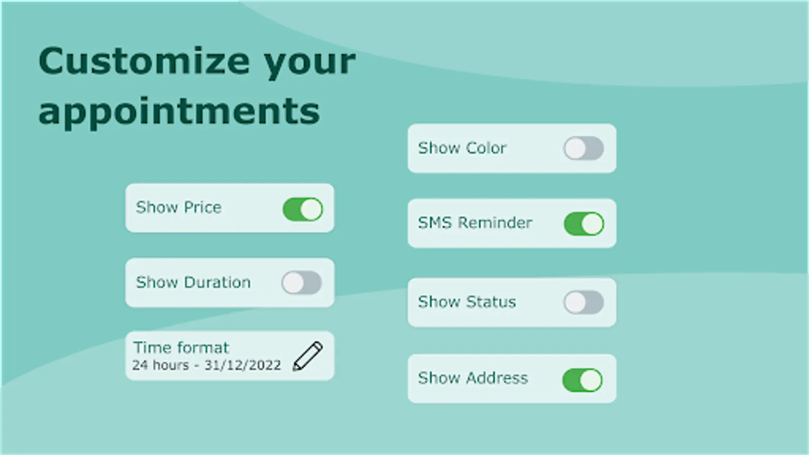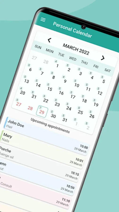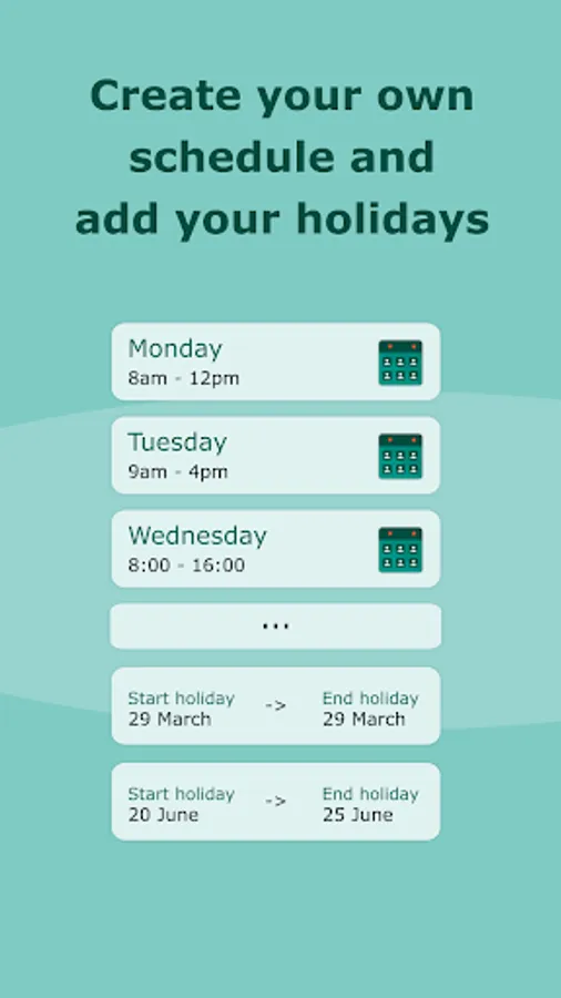 There are many useful features available, such as customizing your schedule for each day, add holidays and set non working days, attach different kinds of options to your appointments like prices, colors, address, duration and so on.