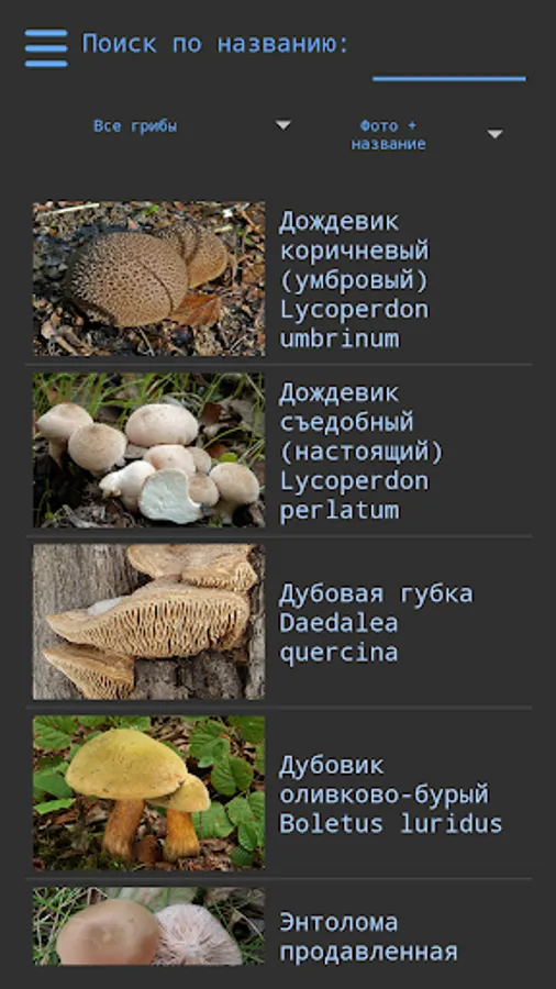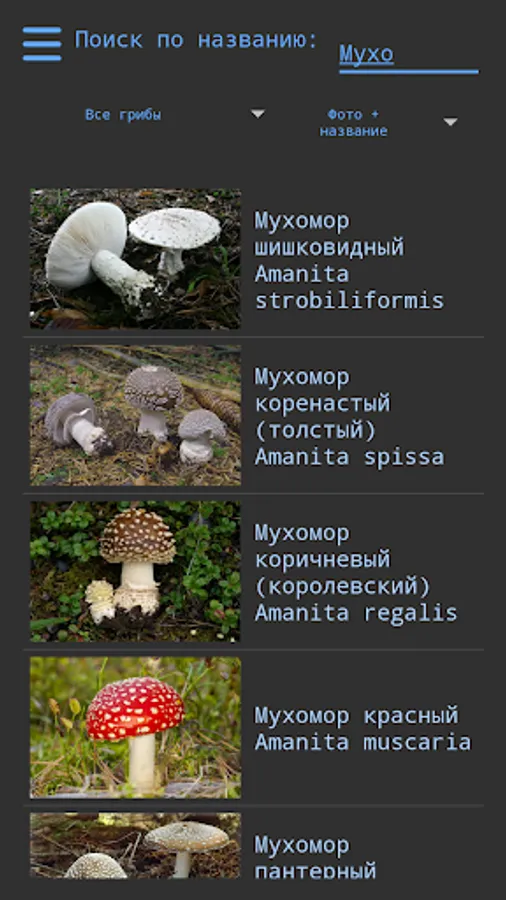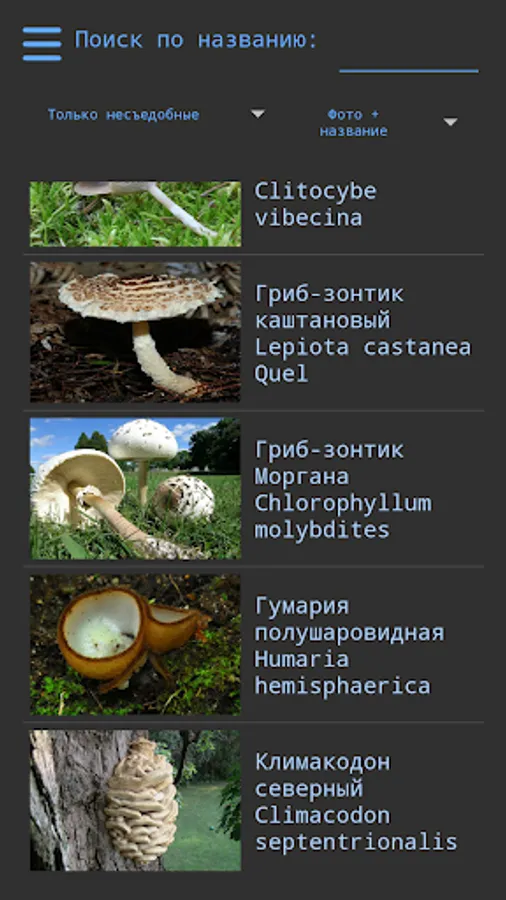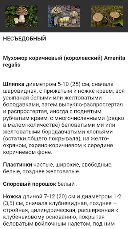 Due to the large amount of information when viewing a list of mushrooms in a photo + name on low-power devices can "Departures" application, if it occurs - use only viewing a name.