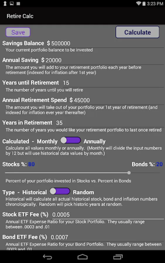 Disclaimer: The information & calculations in this Retirement Investing Calculator Simulator are for educational purposes only, and do not constitute financial advice. Contact a licensed financial planner for specific retirement advice and for making retirement financial decisions. All data points included are correct to the best of our knowledge, but no warranty is made regarding the accuracy or applicability of this data or calculations. The owners / authors of this application (including Workman Consulting LLC) hereby disclaim all responsibility for any use / misuse of this application and the data provided by this application. The authors of this app do not give any warranty as to the accuracy, reliability or completeness of information; and do not accept any liability for any error or omission on this app or for any resulting loss or damage suffered by the recipient or any other person. By downloading and/or using the application, you agree to these terms. Past returns are not indicative of future performance. Even if a retirement investing financial strategy would’ve survived 100% of past simulation scenarios, it does not guarantee that it will do so in the future.