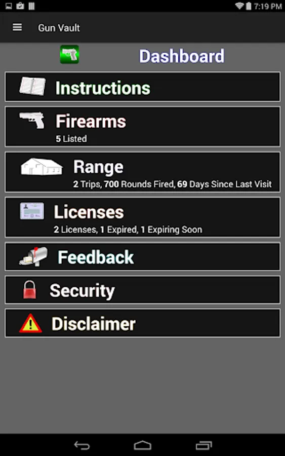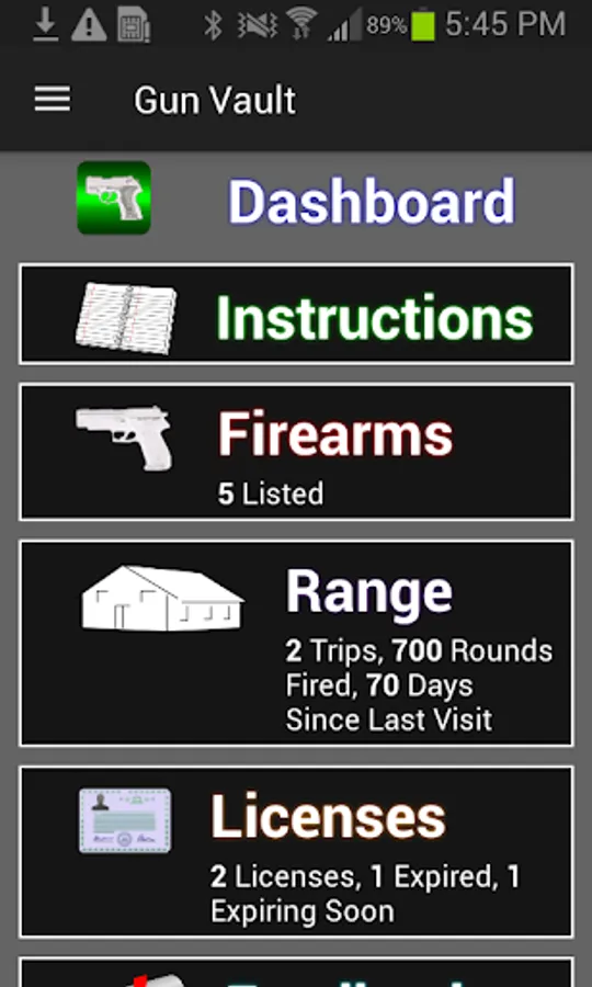 Dashboard – Quick statistics about your Range Trips, Licenses, and Firearms.