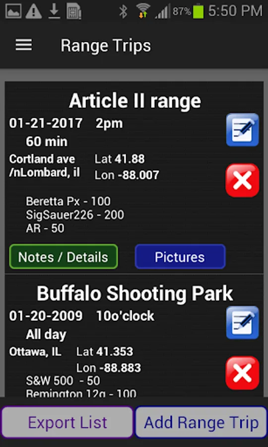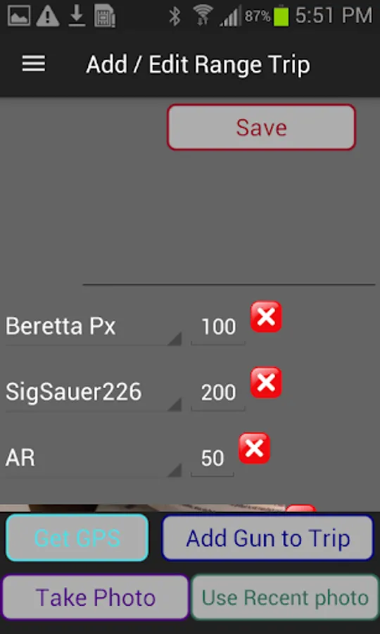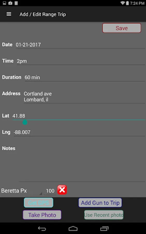 Range Log – Track your range sessions, including firearm used, rounds fired, location, date, time spent, and more. Save the address, GPS and picture of the range.