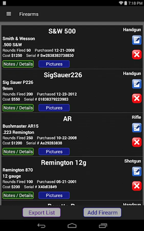 Firearm Log – Track your firearm purchases, serial #, date purchased, price paid, rounds fired, and pictures. Keep this useful data in one place if the firearms are ever lost or stolen. Helpful to record your inventory list of guns in this virtual vault / safe!