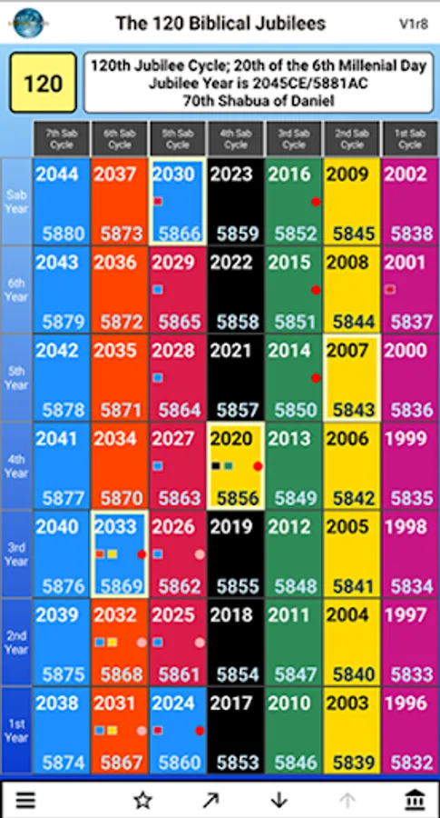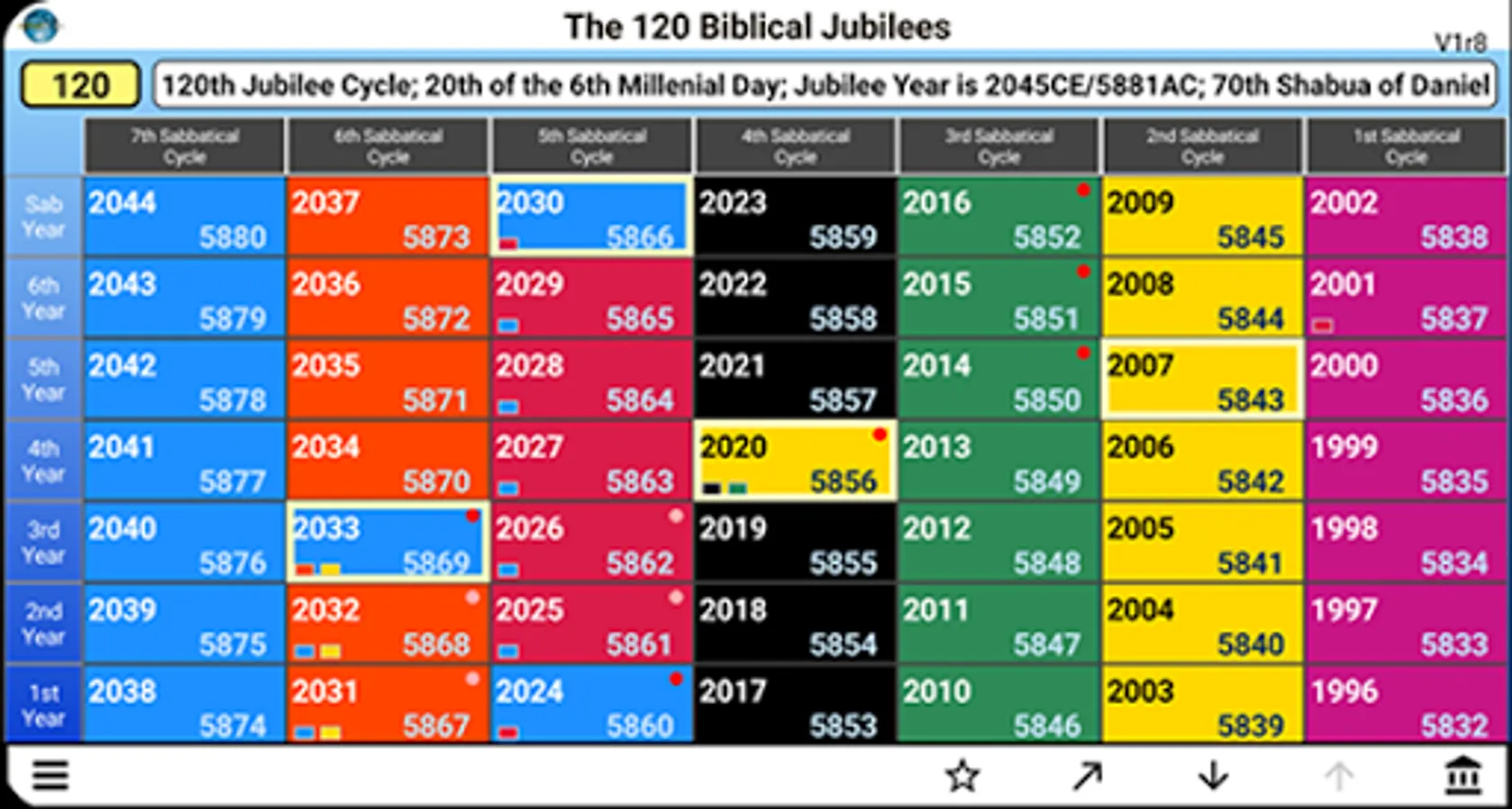 The 120 Jubilee Cycle charts. Each chart shows seven Sabbatical Cycles with seven years each. Forty nine (49) years in a Jubilee Cycle (7 years x 7) - the Jubilee Year is the 50th year and is also the first year of the next Jubilee Cycle. Visit sightedmoon.com for more information.