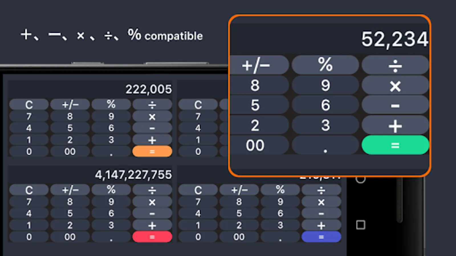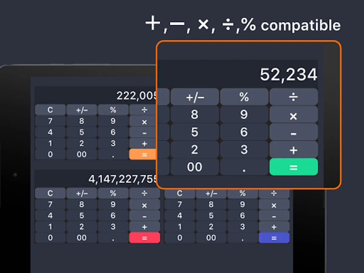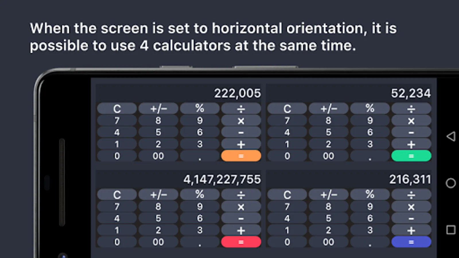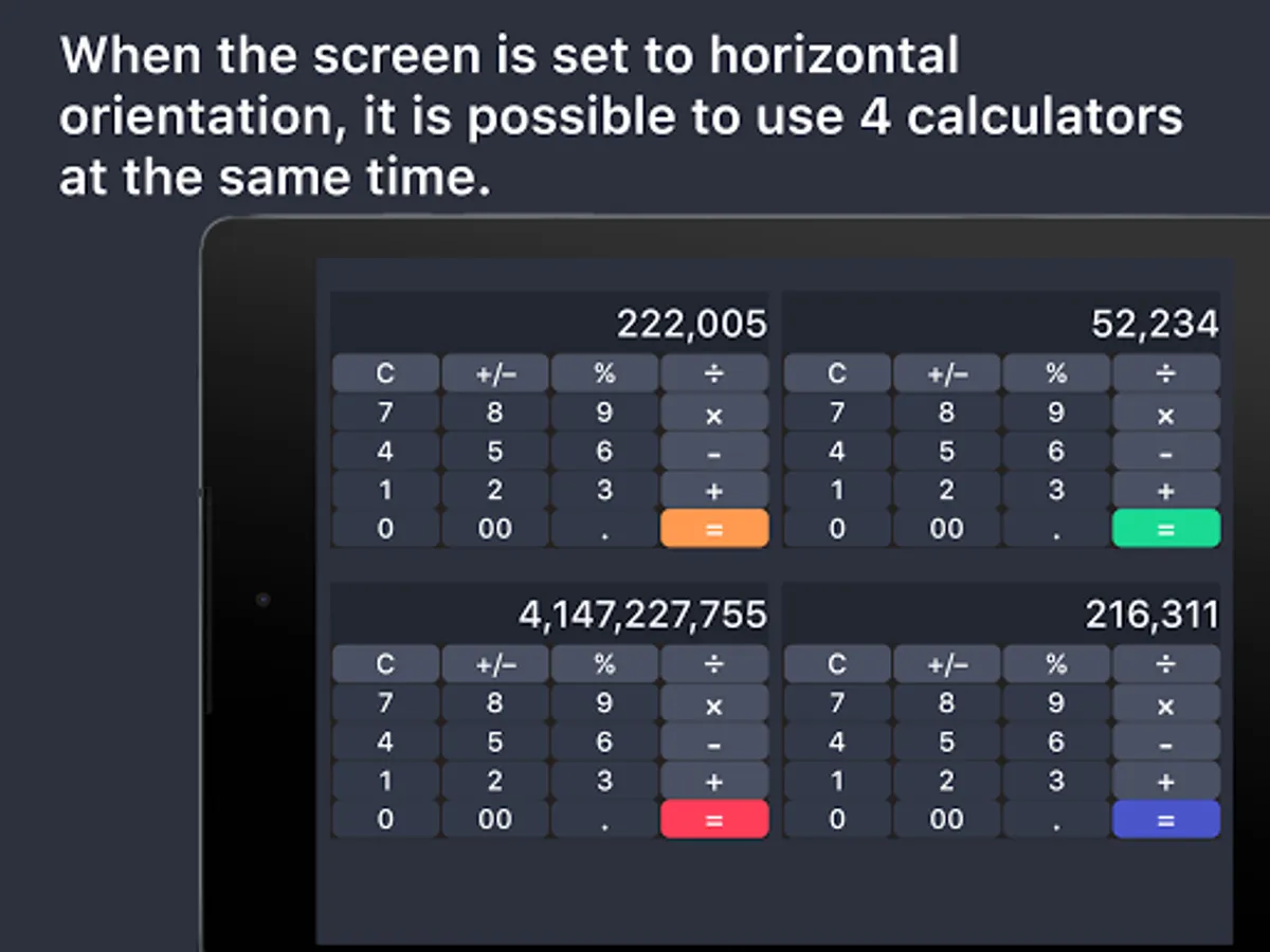 The buttons are large and easy to touch, and have a simple design. In calculator + 4 we put four calculators on one screen when we turned horizontally.
