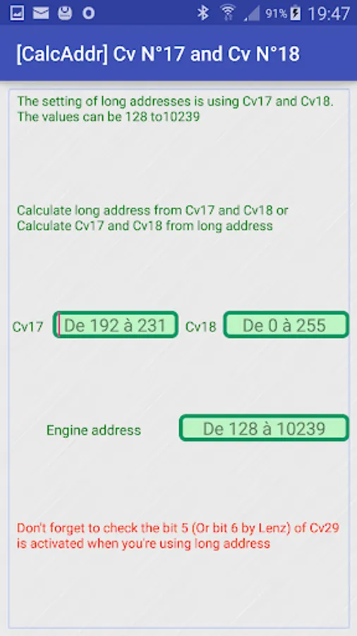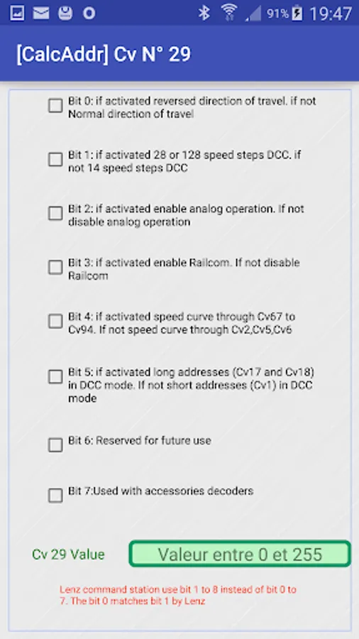 Use Dcc Calc to calculate the value of CV29 and to calculate CV17 and CV18 for long address of your locomotives.