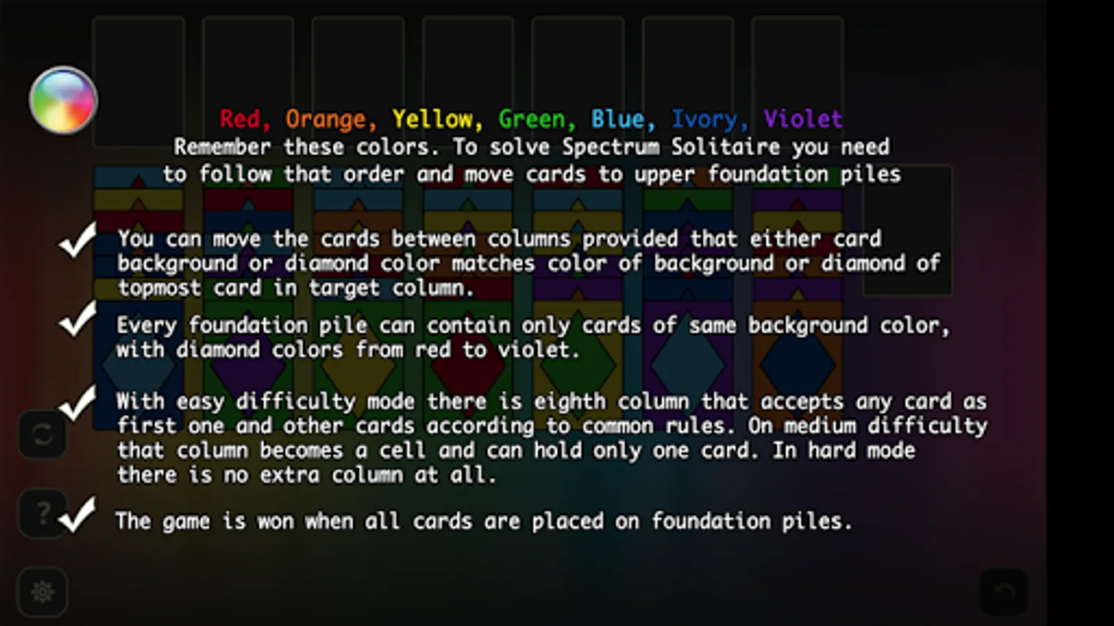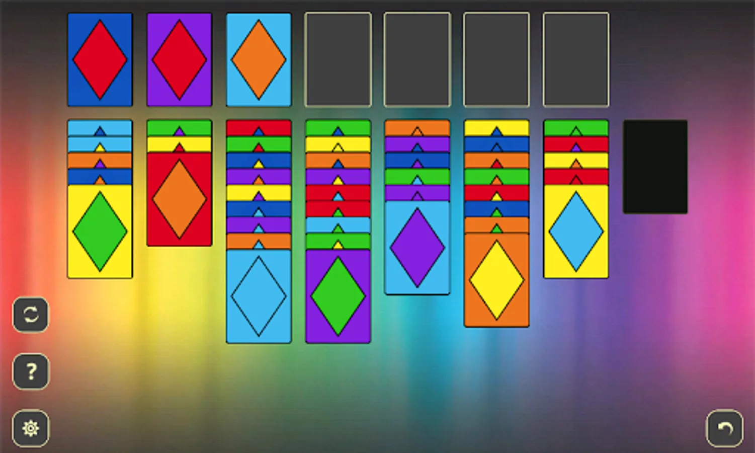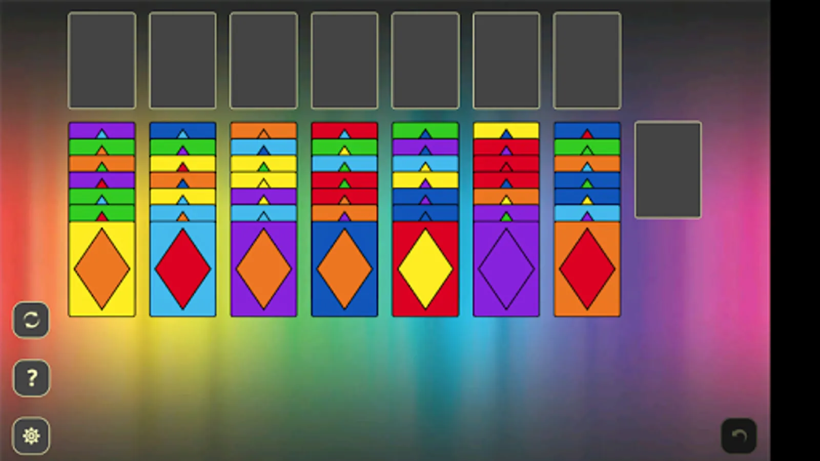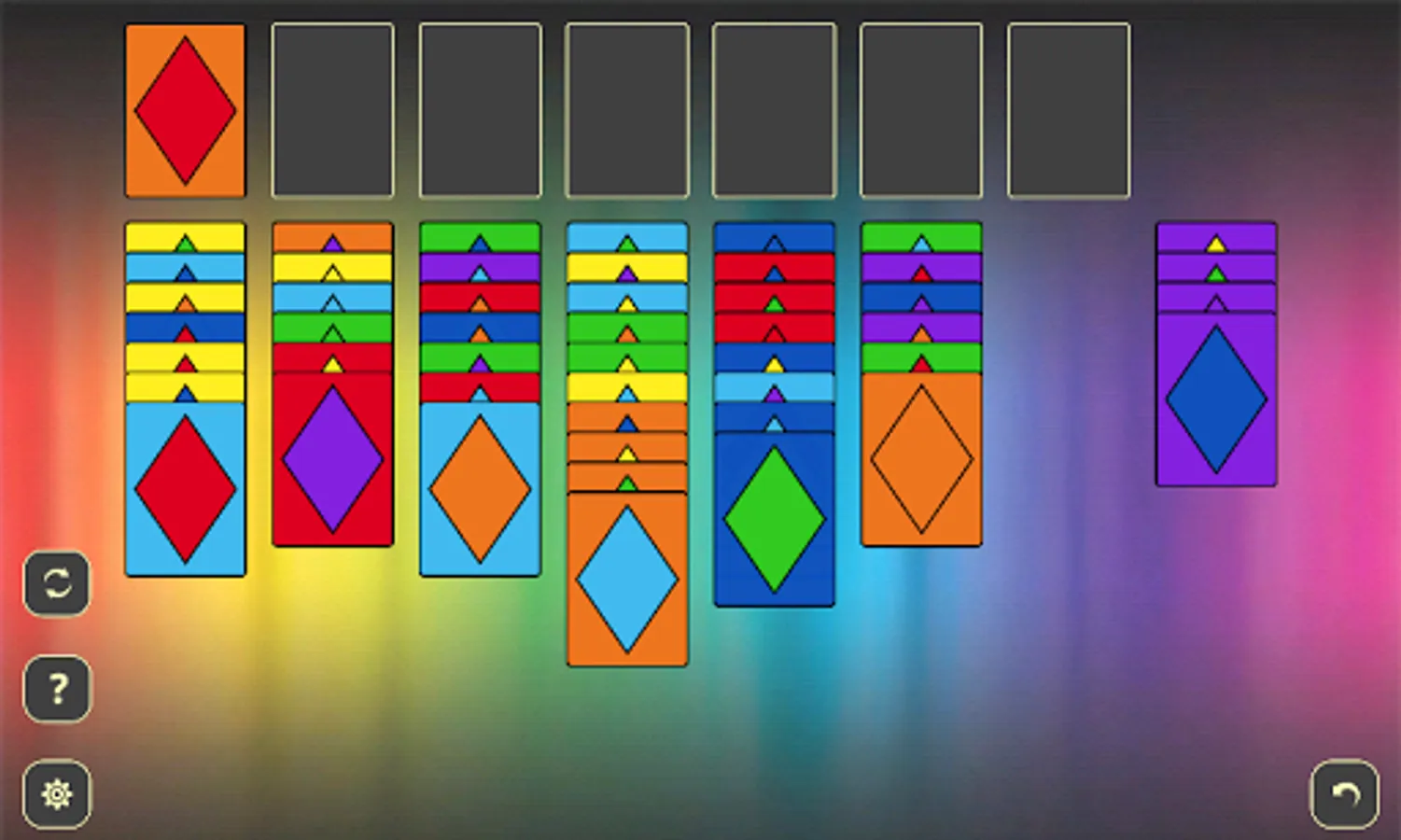 In this solitaire you play with 49 special cards that are made of 7 different backs and 7 diamonds on rainbow colors: red, orange, yellow, green, blue, indigo and violet. Your goal is to move all cards from game field to foundations with set of simple rules: