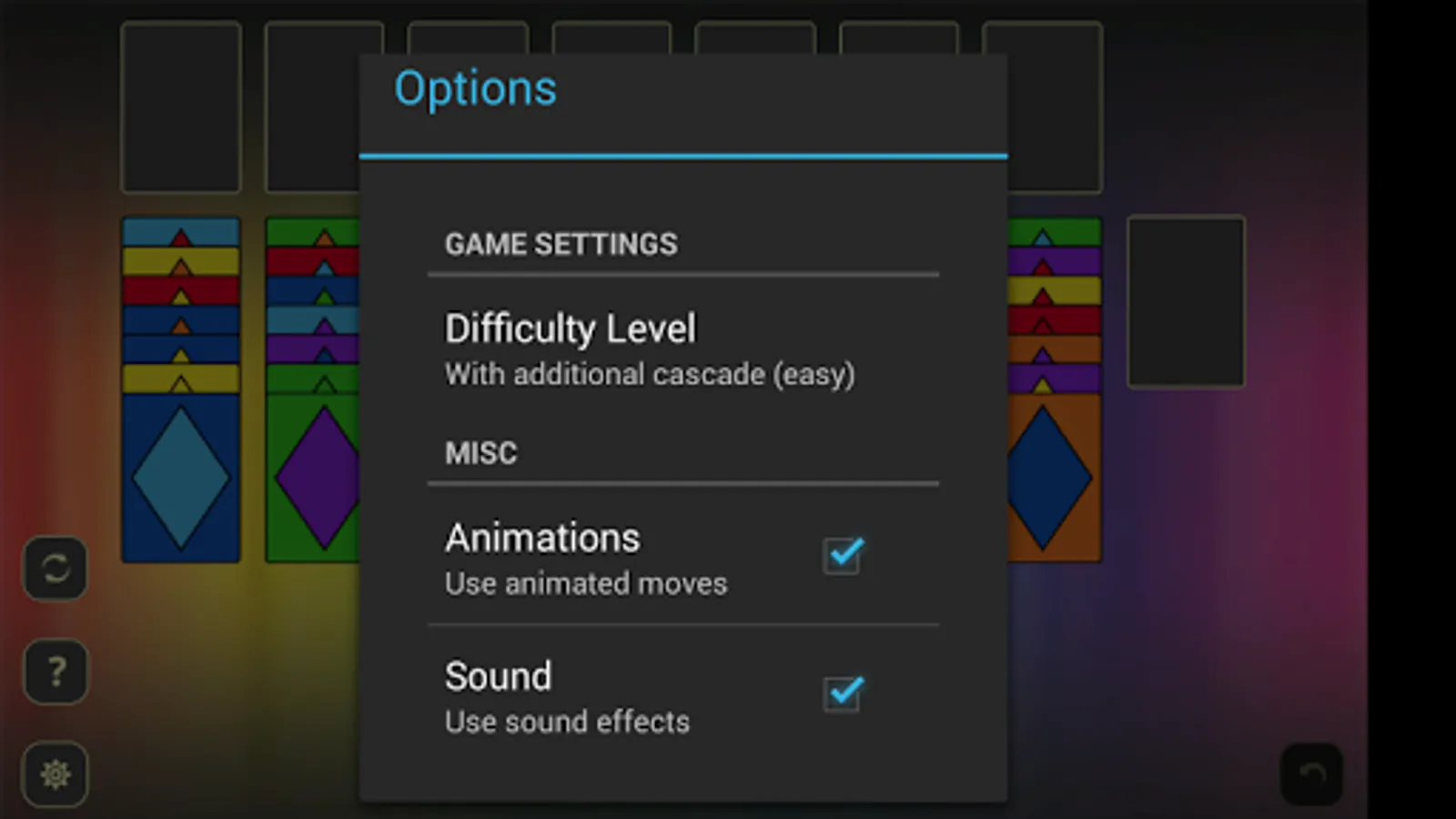 * With easy difficulty mode there is eighth column that accepts any card as first one and other cards according to common rules. On medium difficulty that column becomes a cell and can hold only one card. In hard mode there is no extra column at all.