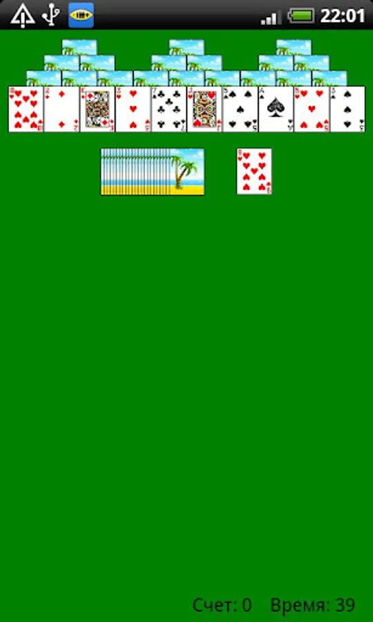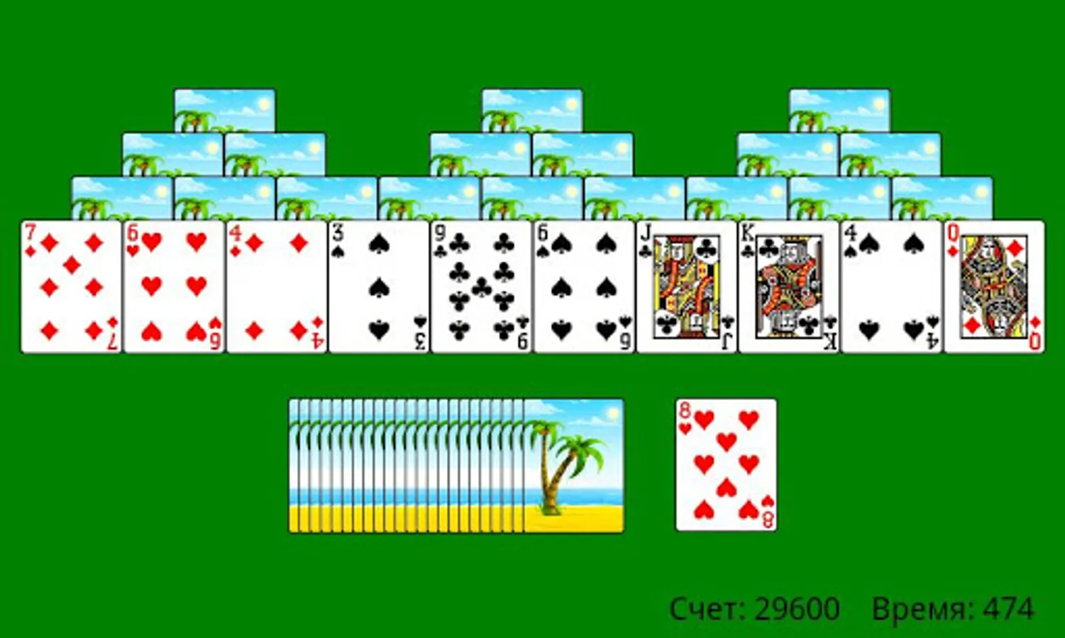 The game starts with eighteen cards dealt face-down on the tableau to form three pyramids with three overlapping tiers each. Over these three pyramids are ten face-up cards.