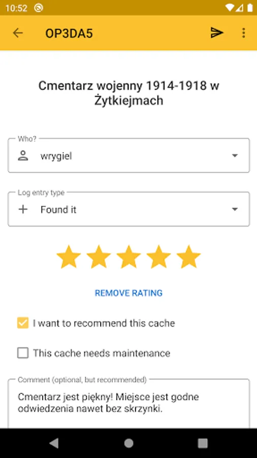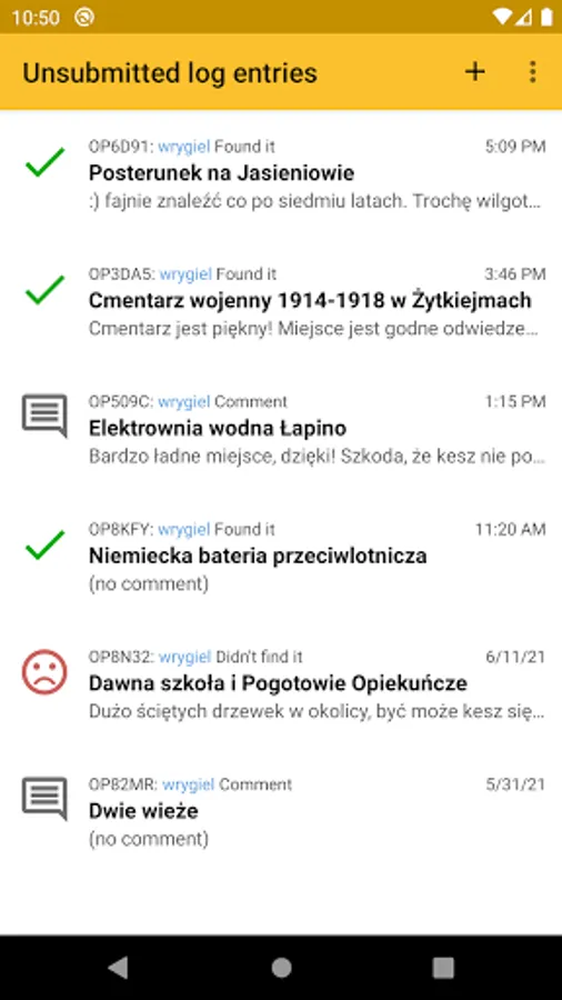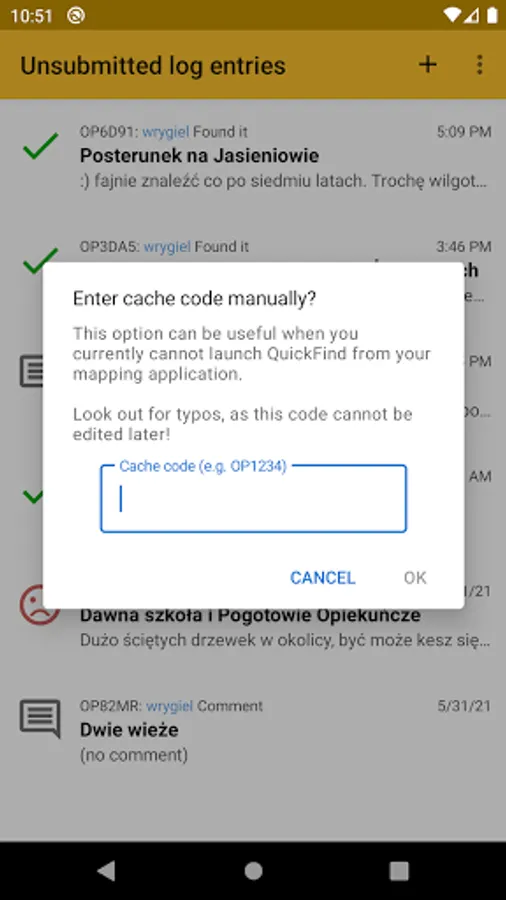 QuickFind lets you post new Opencaching.PL/DE/US/UK/NL log entries directly from your phone. When you're offline, your log entries will be posted as soon as you become online again.