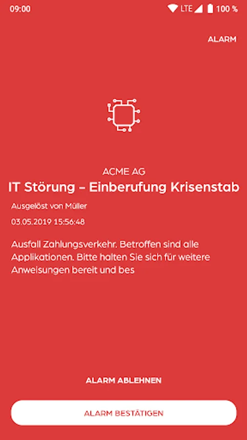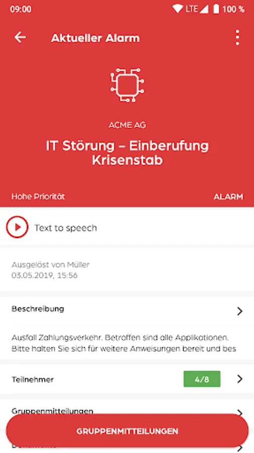 With the app, all alerting and crisis management functions of the safeREACH system are available to you on the move. Predefined scenarios can be easily adapted and triggered at the push of a button. Active alarms can be easily controlled using the app and information and instructions can be distributed in a structured manner. Documents, photos, checklists and instructions are available to the participants in the virtual crisis room. Group messages are used to distribute important information to all alarm participants at any time. In addition to the management function, the app is also used to receive alarms and offers exclusive security features.