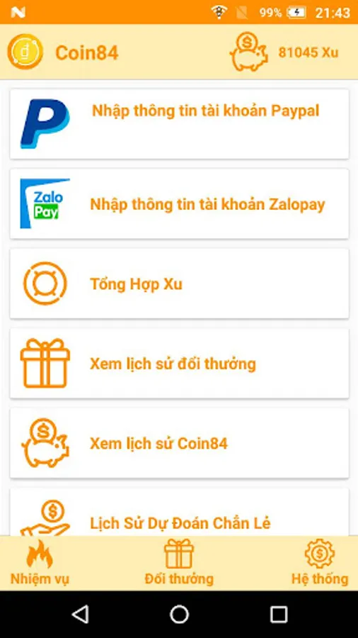Coin84 - Trung Tâm Kiếm Tiền Online - Quản lí và cung cấp các nhiệm vụ cơ bản cho người dùng. Bằng cách hoàn thành các nhiệm vụ được giao, bạn nhận được thù lao la Xu trong app. Xu có thể đổi thành card, tiền mặt qua Paypal, Zalopay, Ngân Hàng, vvv