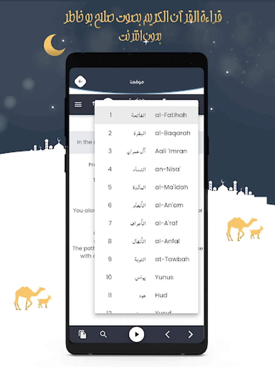 After downloading the application, you can listen to the surahs of the Noble Qur’an with the voice of Sheikh Salah Bu Khater for free, anytime, anywhere, with ease.