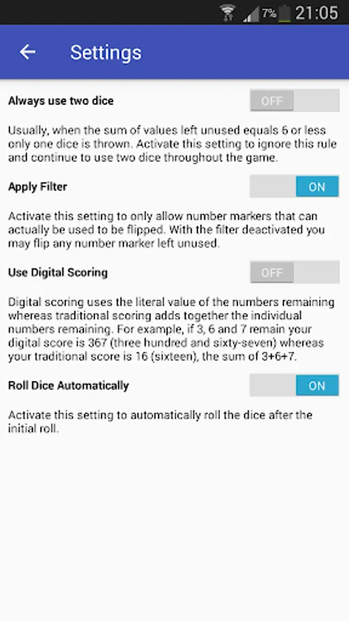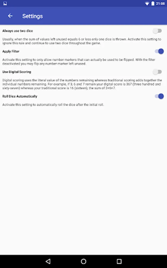 Usually, when the sum of values left unused equals 6 or less only one dice is thrown. Activate this setting to ignore this rule and continue to use two dice throughout the game.