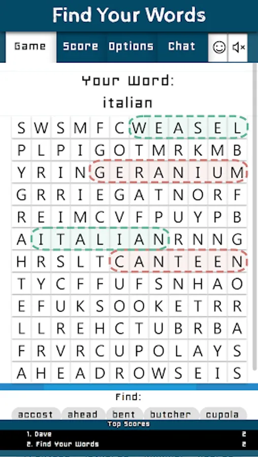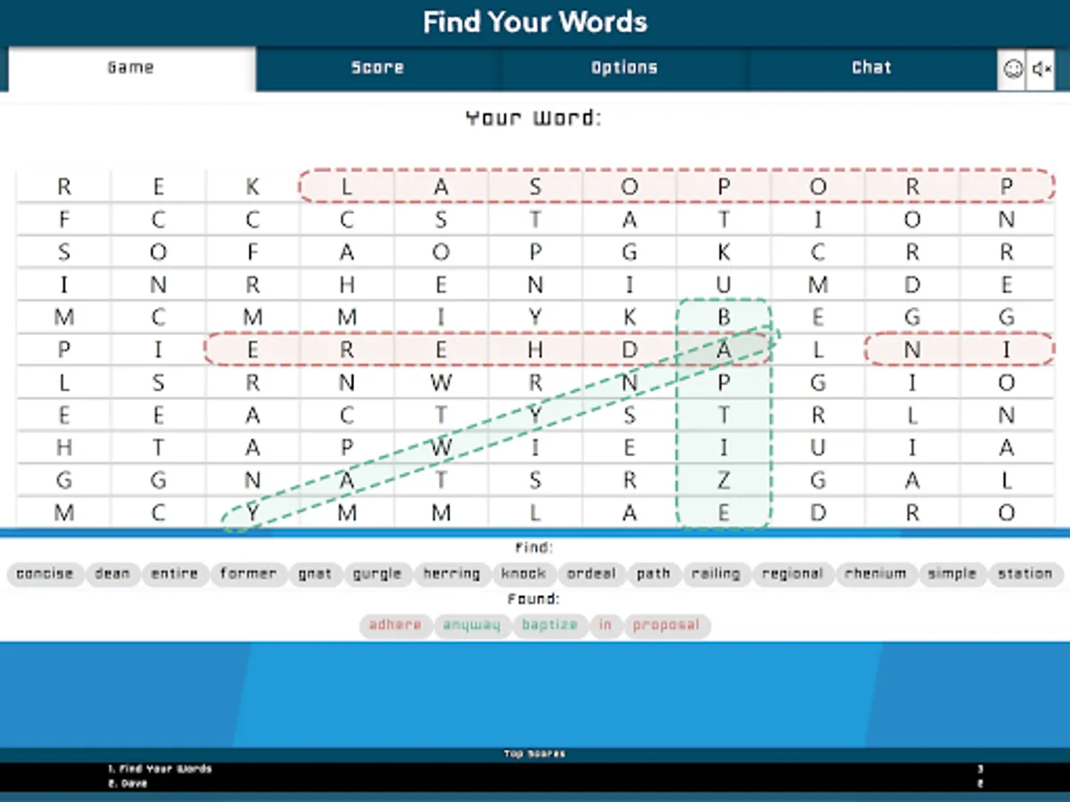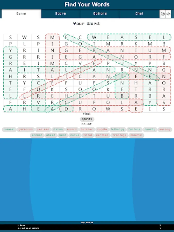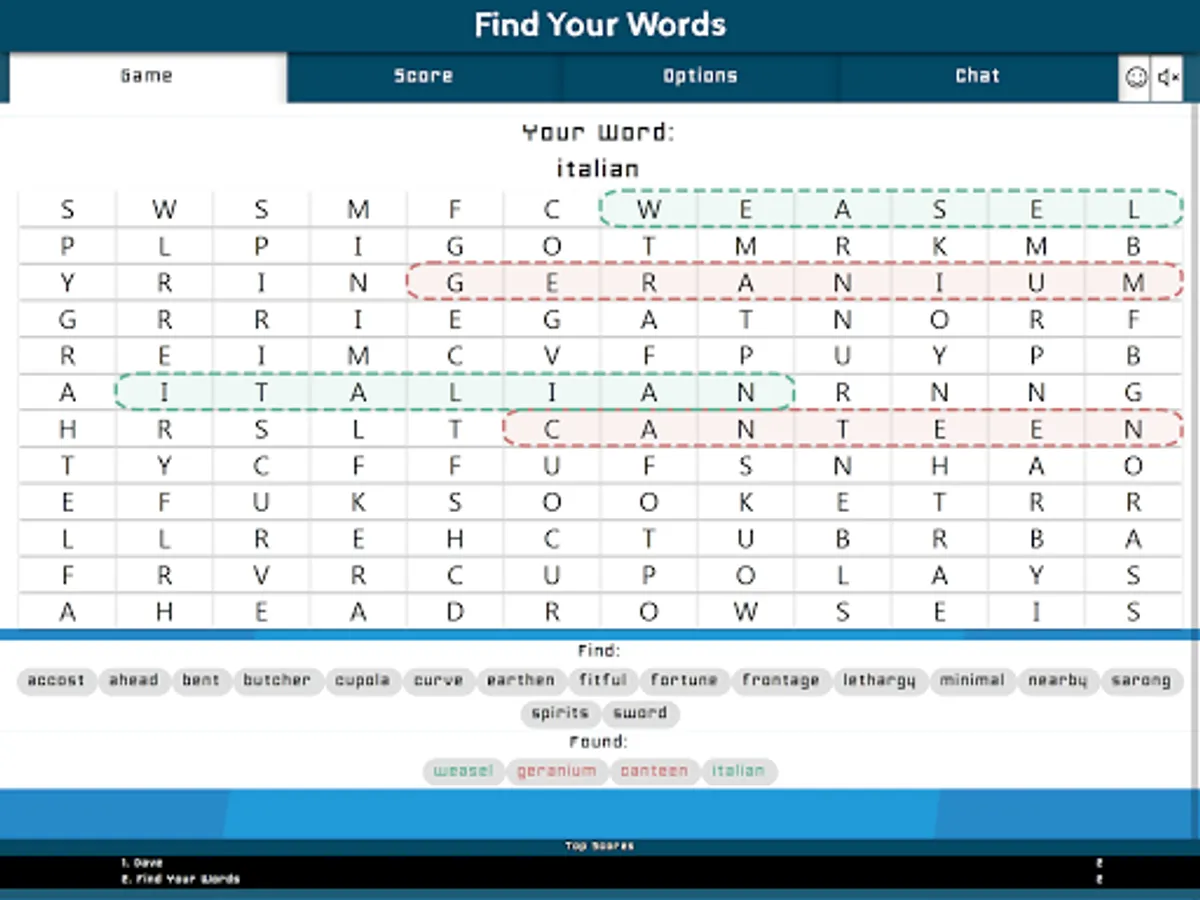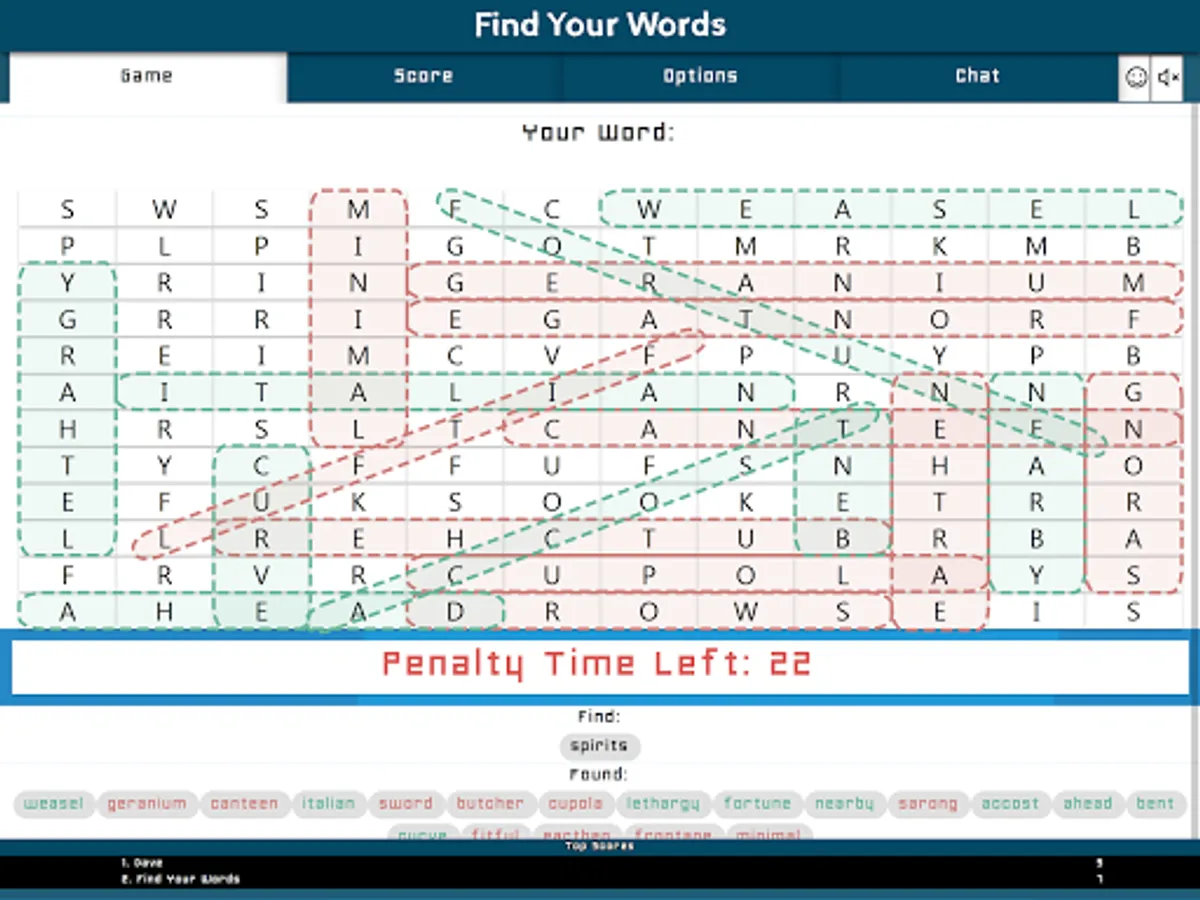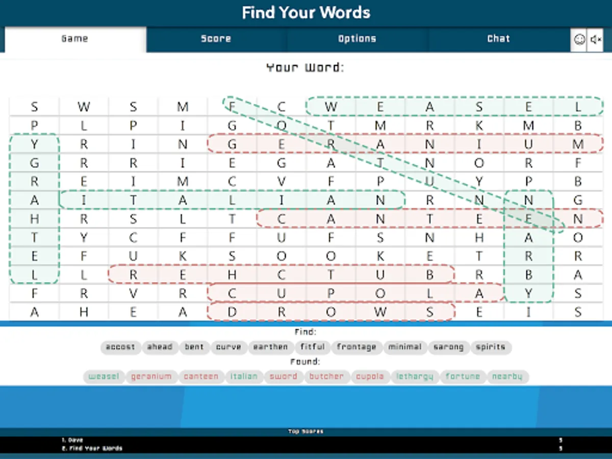 As this is a multi-player game, other players also try to find the words. Every word they find, is highlighted in their own color. You cannot submit a word that has been submitted by someone else.