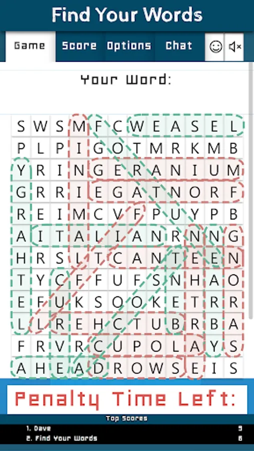 To find a word touch the first letter of the word and drag towards the last letter of the word. Release your screen to submit the found word. If you are correct, you will earn a point and the word is crossed off for all the players. If you select a wrong word, you'll get a time-out penalty and one point is subtracted from your score.