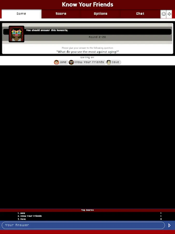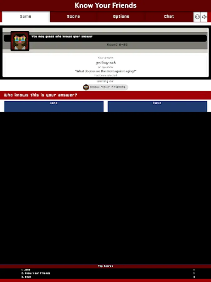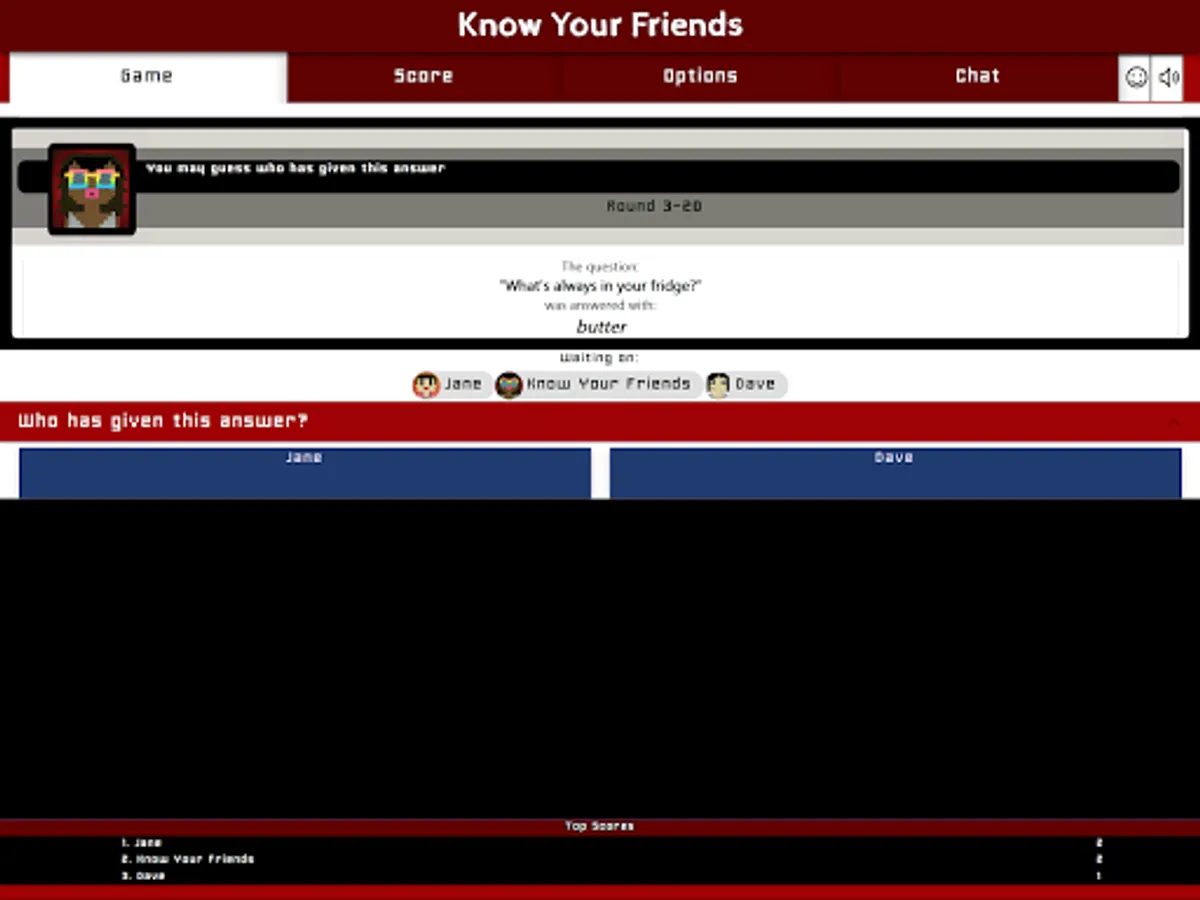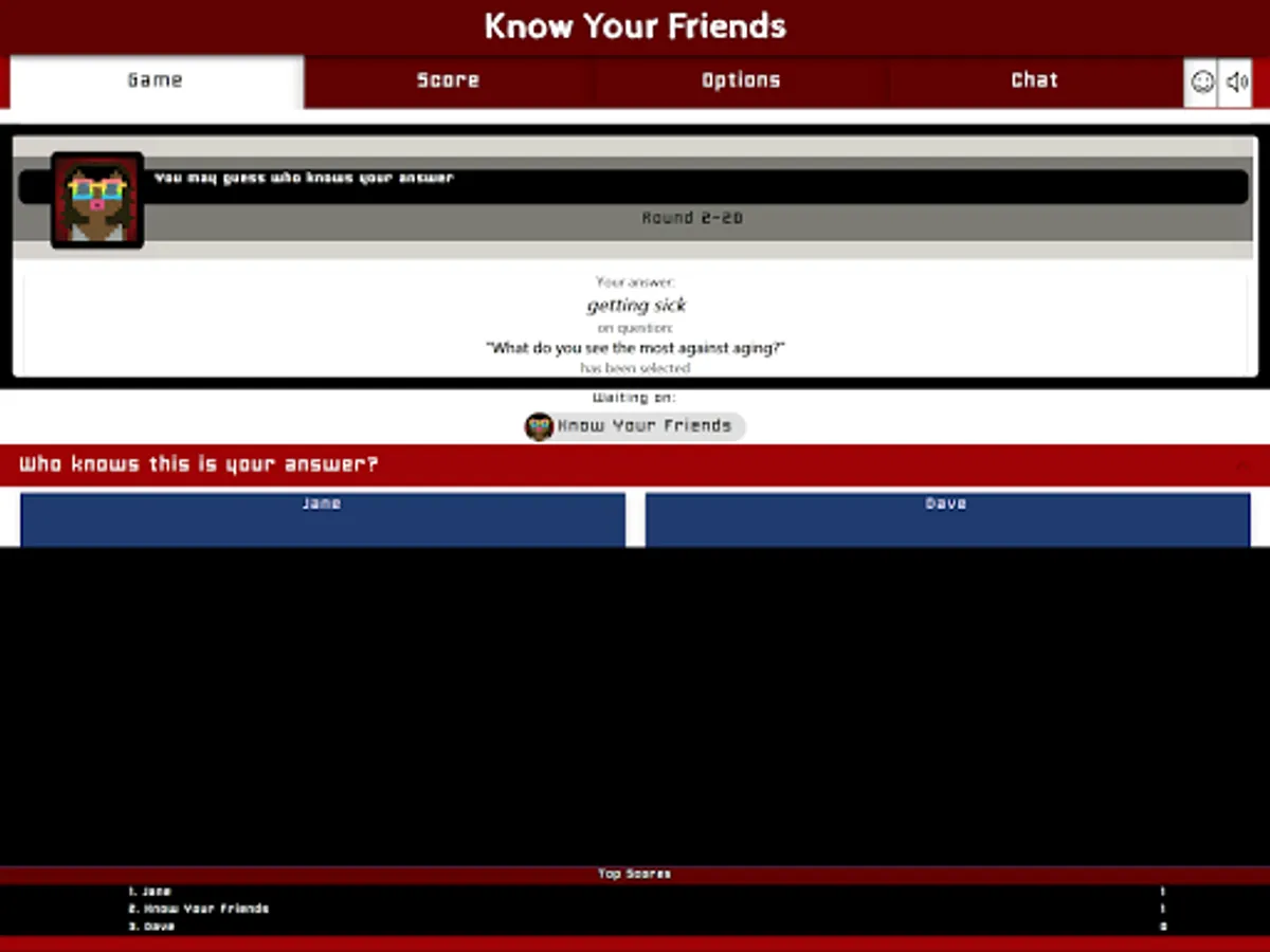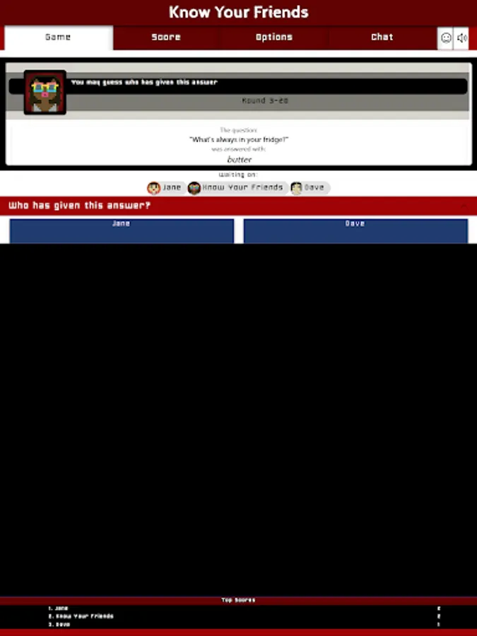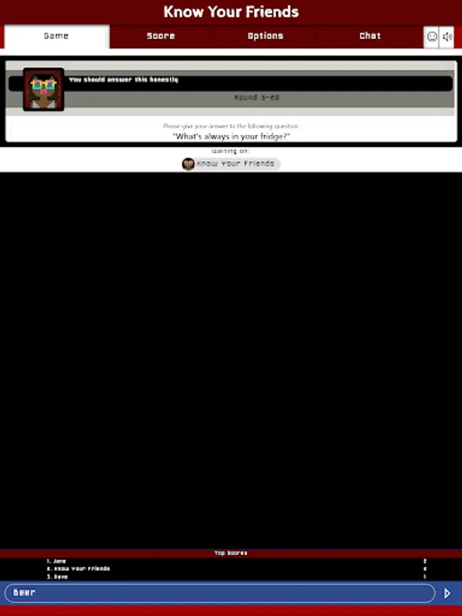 Know Your Friends is a multiplayer game for a minimum of three players that allows you to learn interestng things about your friends. The goal of the game is to guess which friend has given a certain answer to a question that tells more about this person.