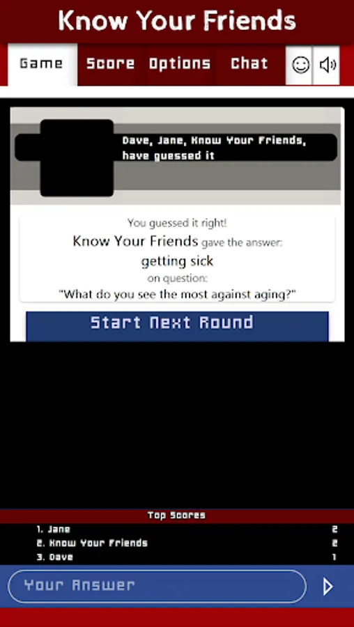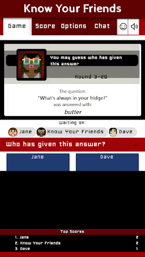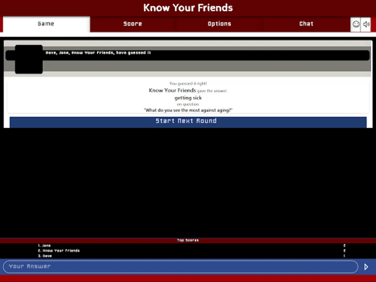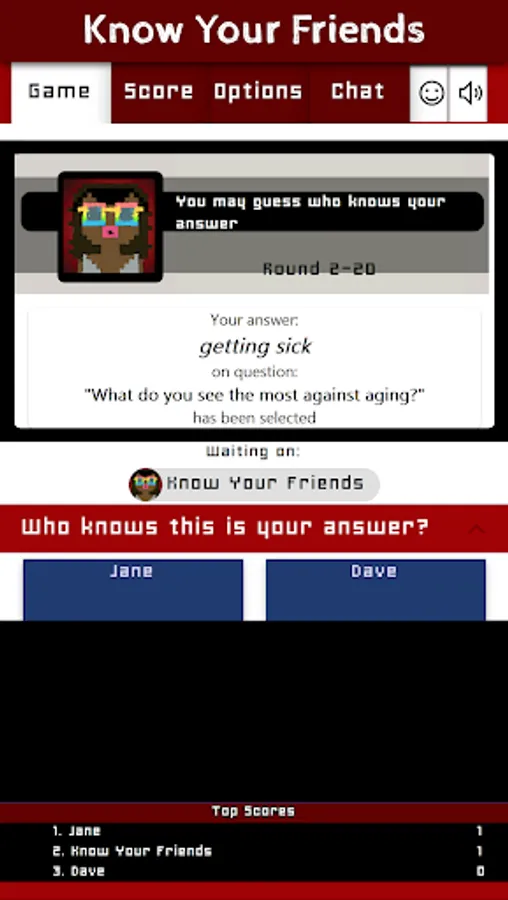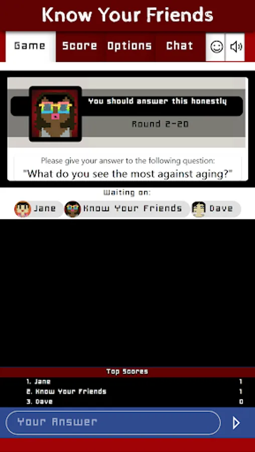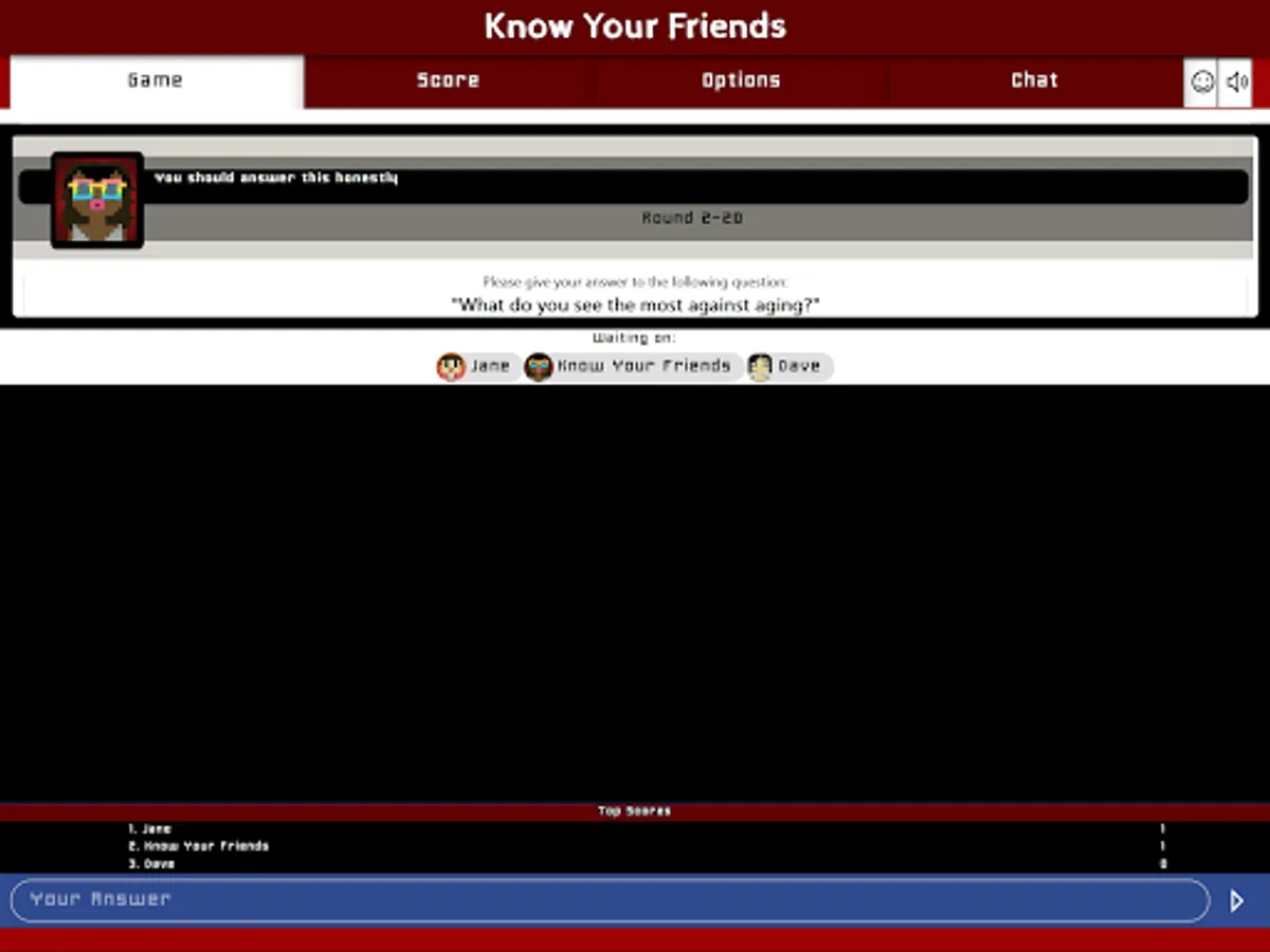 Know Your Friends is a multiplayer game for a minimum of three players that allows you to learn interestng things about your friends. The goal of the game is to guess which friend has given a certain answer to a question that tells more about this person.