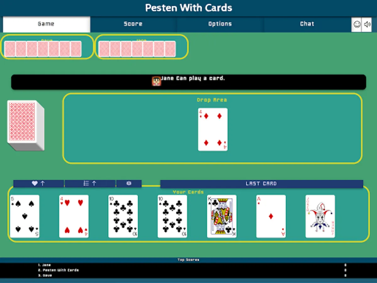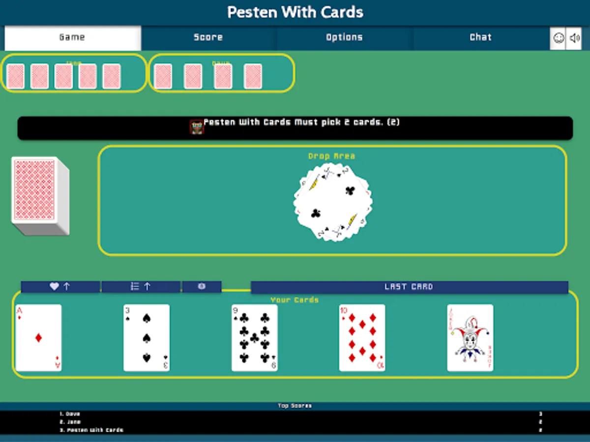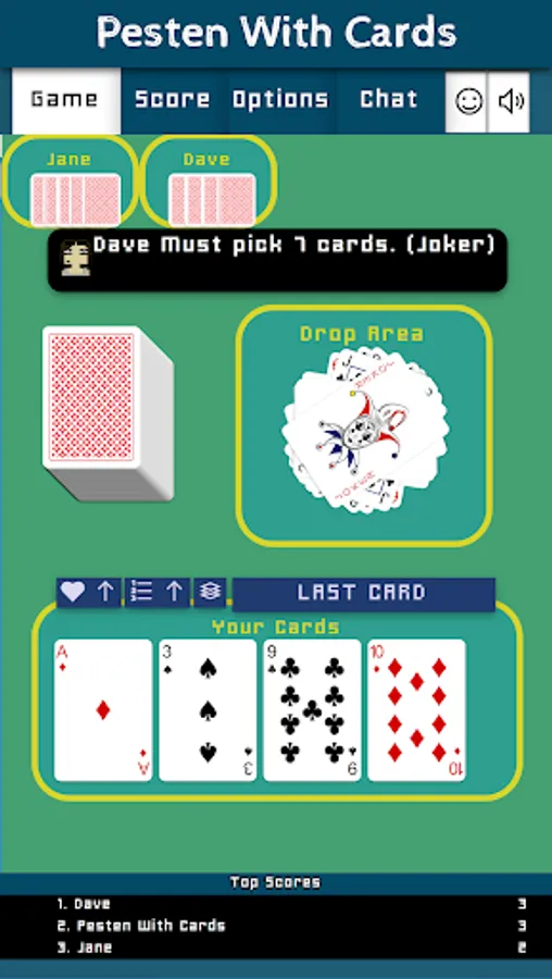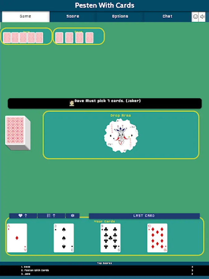 Pesten With Cards is a classic Dutch card game that litteraly means Bullying With Cards. Other countries play similair games like Mau-Mau, Crazy Eights, Shedding, Puque, Чешский Дурак, Фараон, Крокодил, Tschau Sepp or Uno. The goal of the game is to be first to get rid of all of one's cards. The winner will have to say "Last Card" before playing its winning card. If you forget to say "Last Card" when playing your winning card you must picks two cards as a penalty.