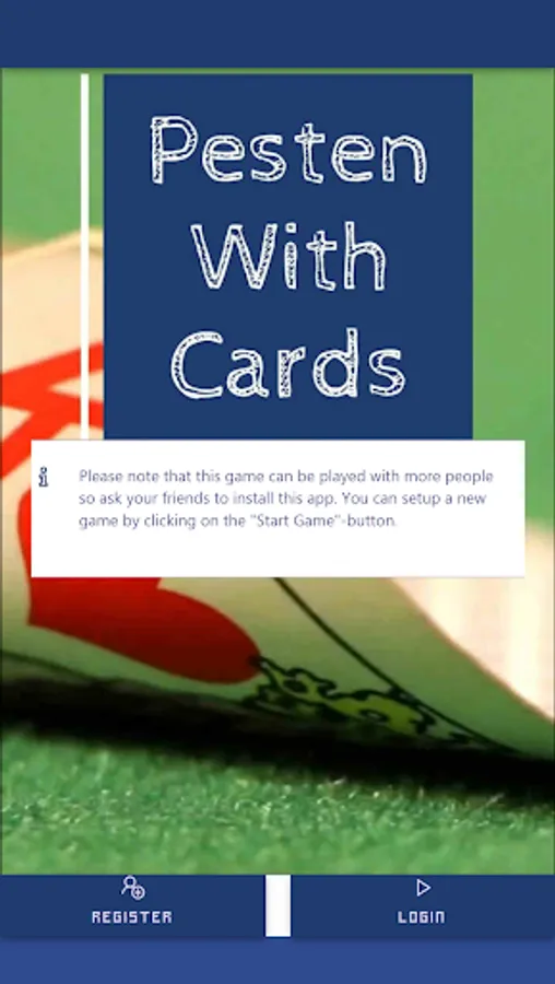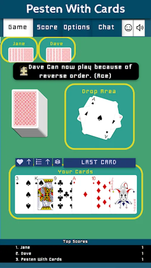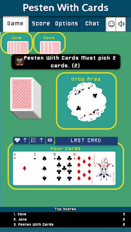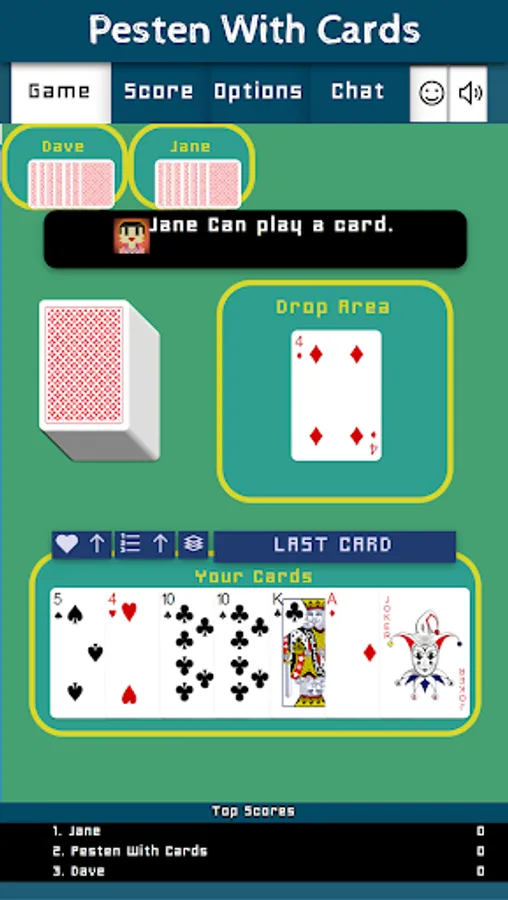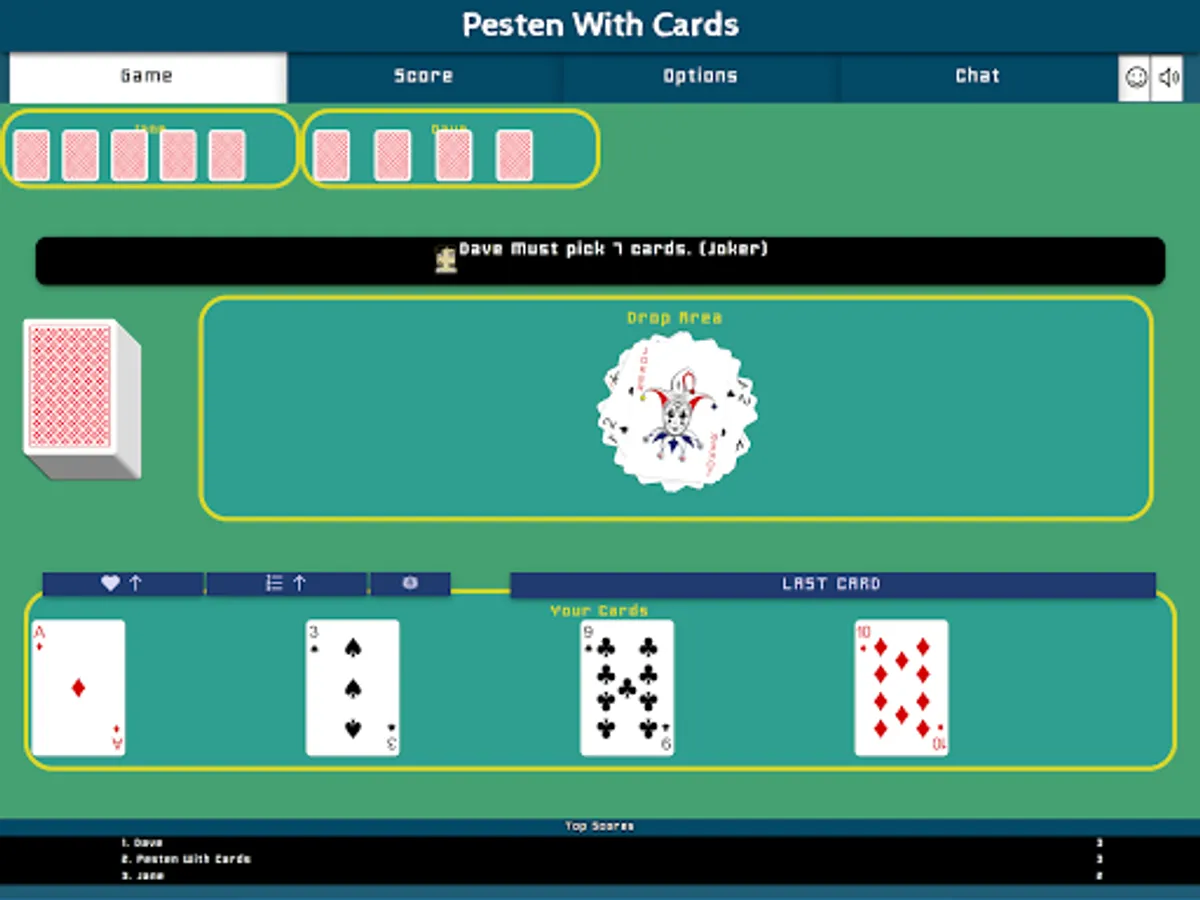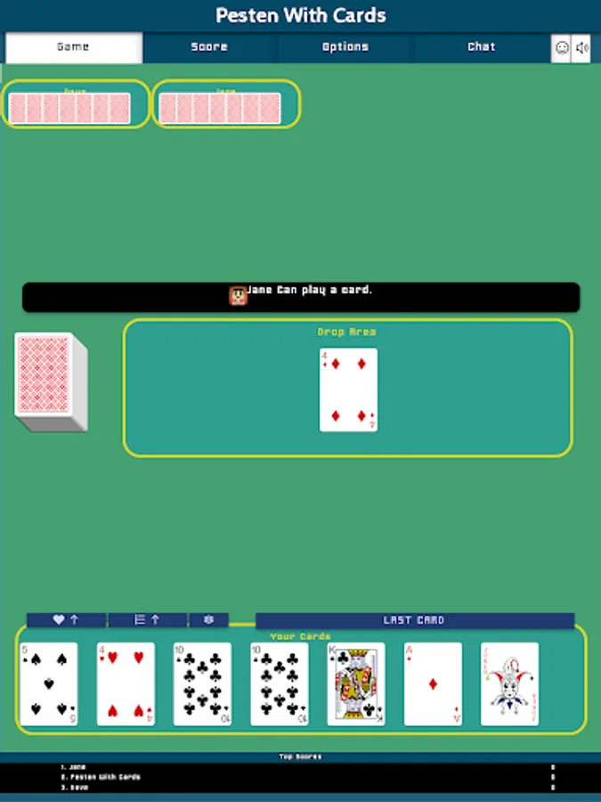 Pesten With Cards is a classic Dutch card game that litteraly means Bullying With Cards. Other countries play similair games like Mau-Mau, Crazy Eights, Shedding, Puque, Чешский Дурак, Фараон, Крокодил, Tschau Sepp or Uno. The goal of the game is to be first to get rid of all of one's cards. The winner will have to say "Last Card" before playing its winning card. If you forget to say "Last Card" when playing your winning card you must picks two cards as a penalty.