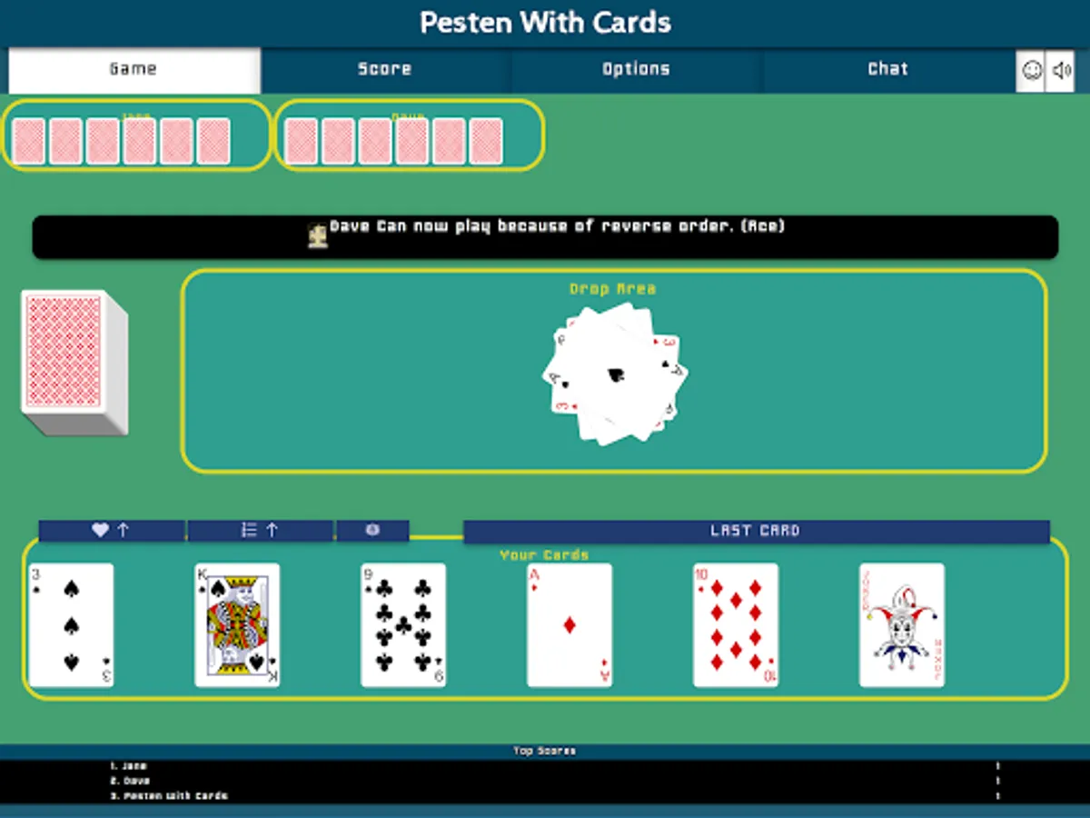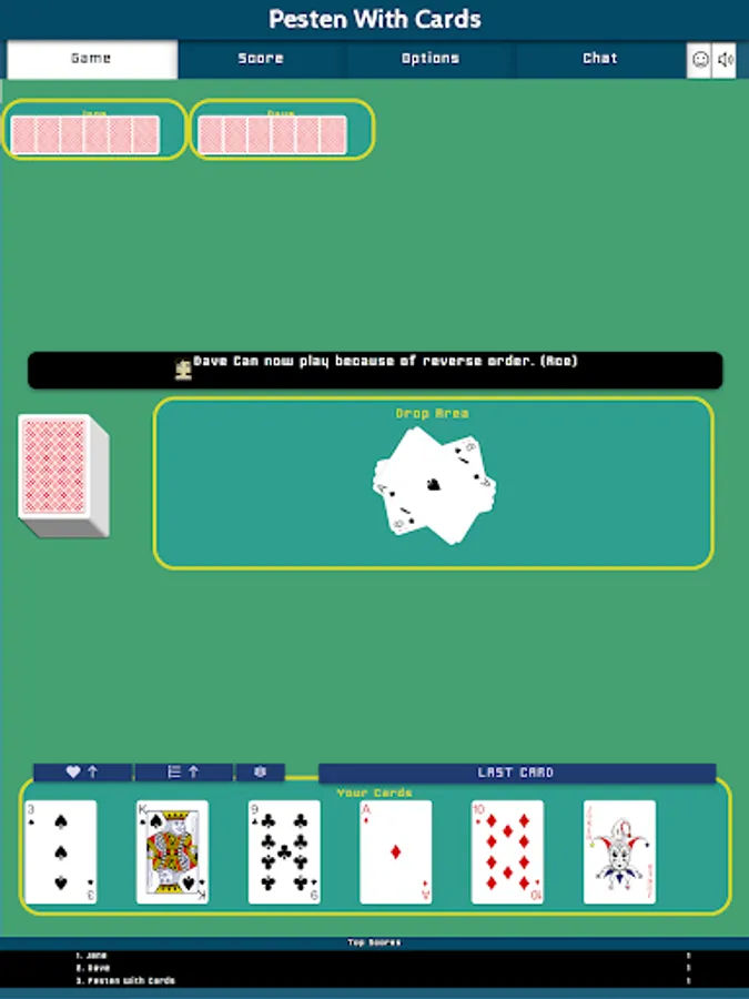 When it's your turn, you must play one of your cards by sliding it to the pile. You can only play a card that has the same number, or has the same suit of the card on the pile. Exception to these are the Jokers and Jacks, which can be placed on every card. If you are not able to play any card from you hand, you must pick a card from the stock that will be added to your cards on hand. If this card would fit on the pile, you are asked if you want to play it immediately, or keep it on hand.