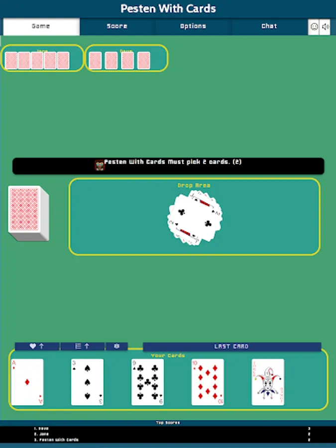 The next player must pick 2 cards from the stack. If that player has a 2 in hand, it can also play that 2, after which the player after that must pick 4 cards from the stack. Each played two adds 2 cards to be picked. If enabled in the options, it is also possible to play a joker on a two, adding 5 cards to be picked. It is not possible to play a two on a joker. If you need to pick cards, you are not allowed to play any of them, and the next player must play.
