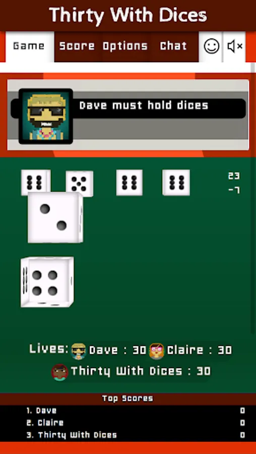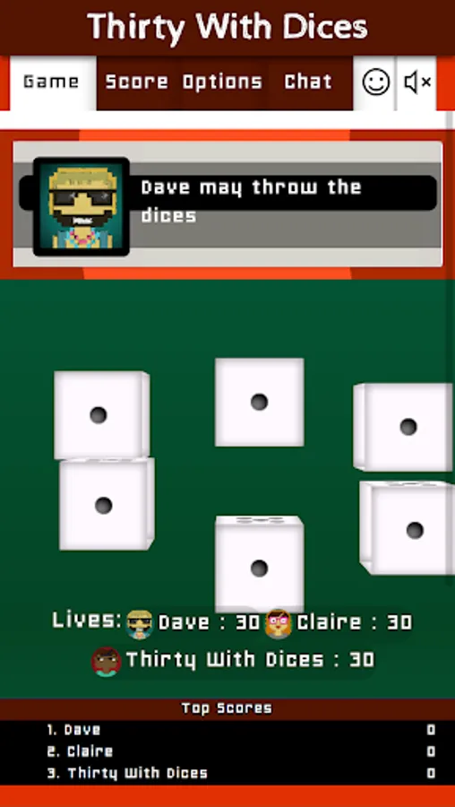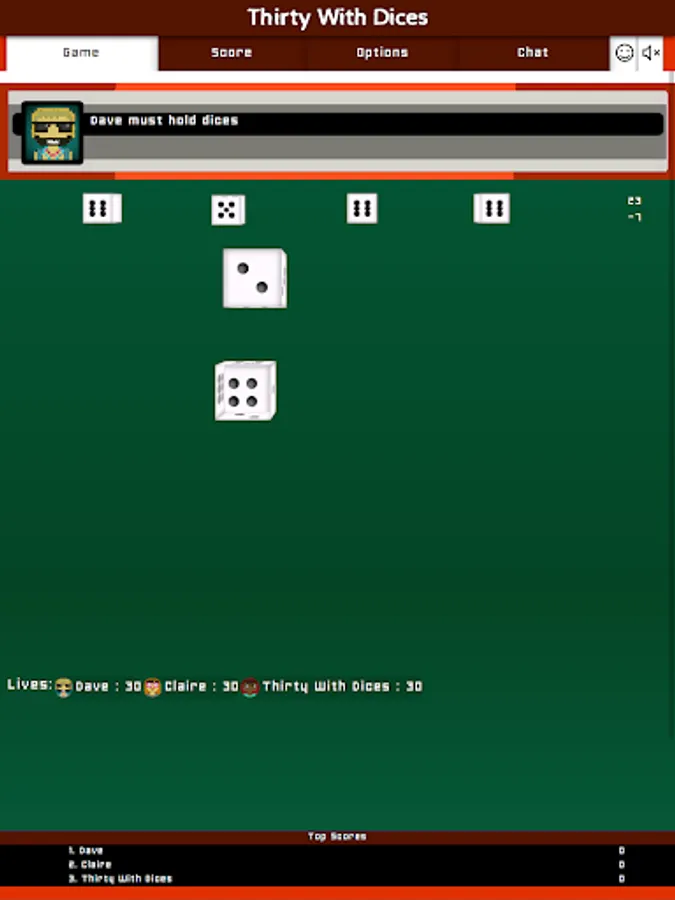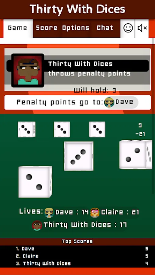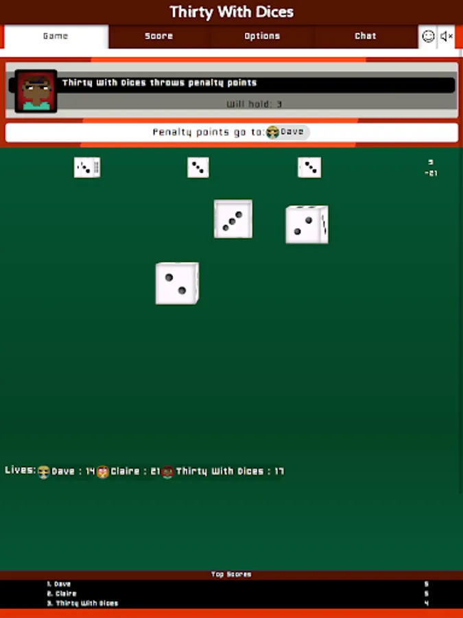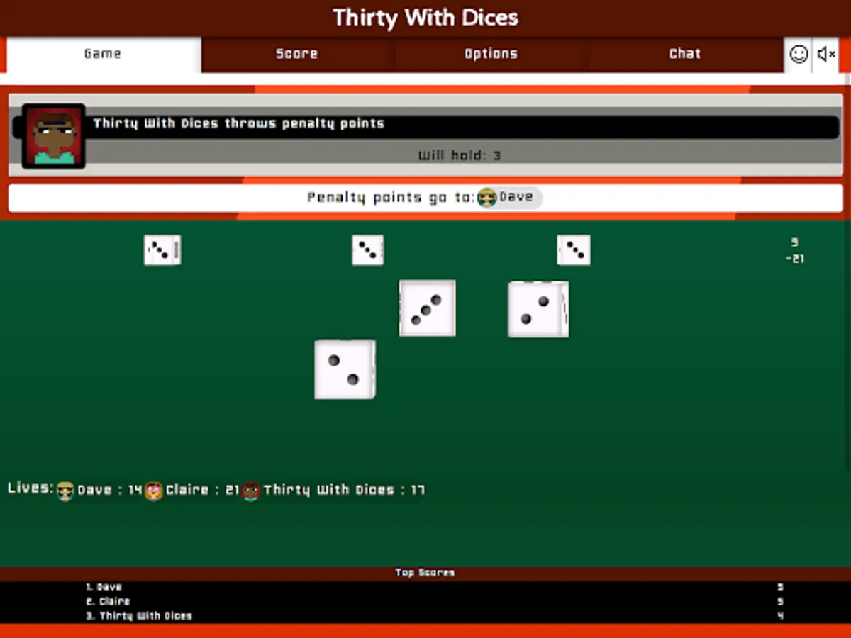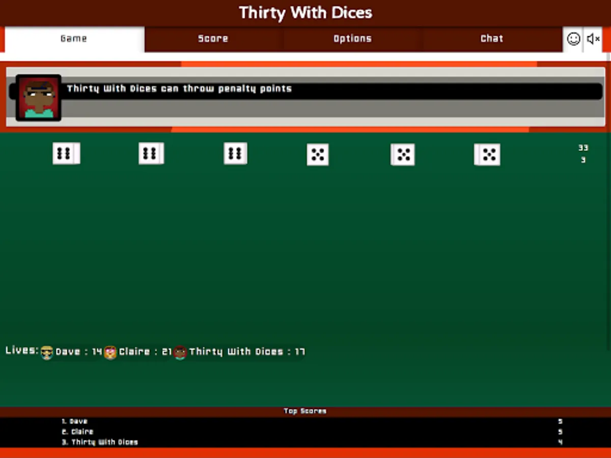 Note: If you are able to hold all dices with the same penalty points, you are allowed to continue with all the six dices for a new round. The total amount of penalty points are stored, and each new dice will be added tot the penalty total.