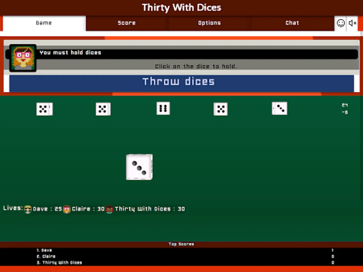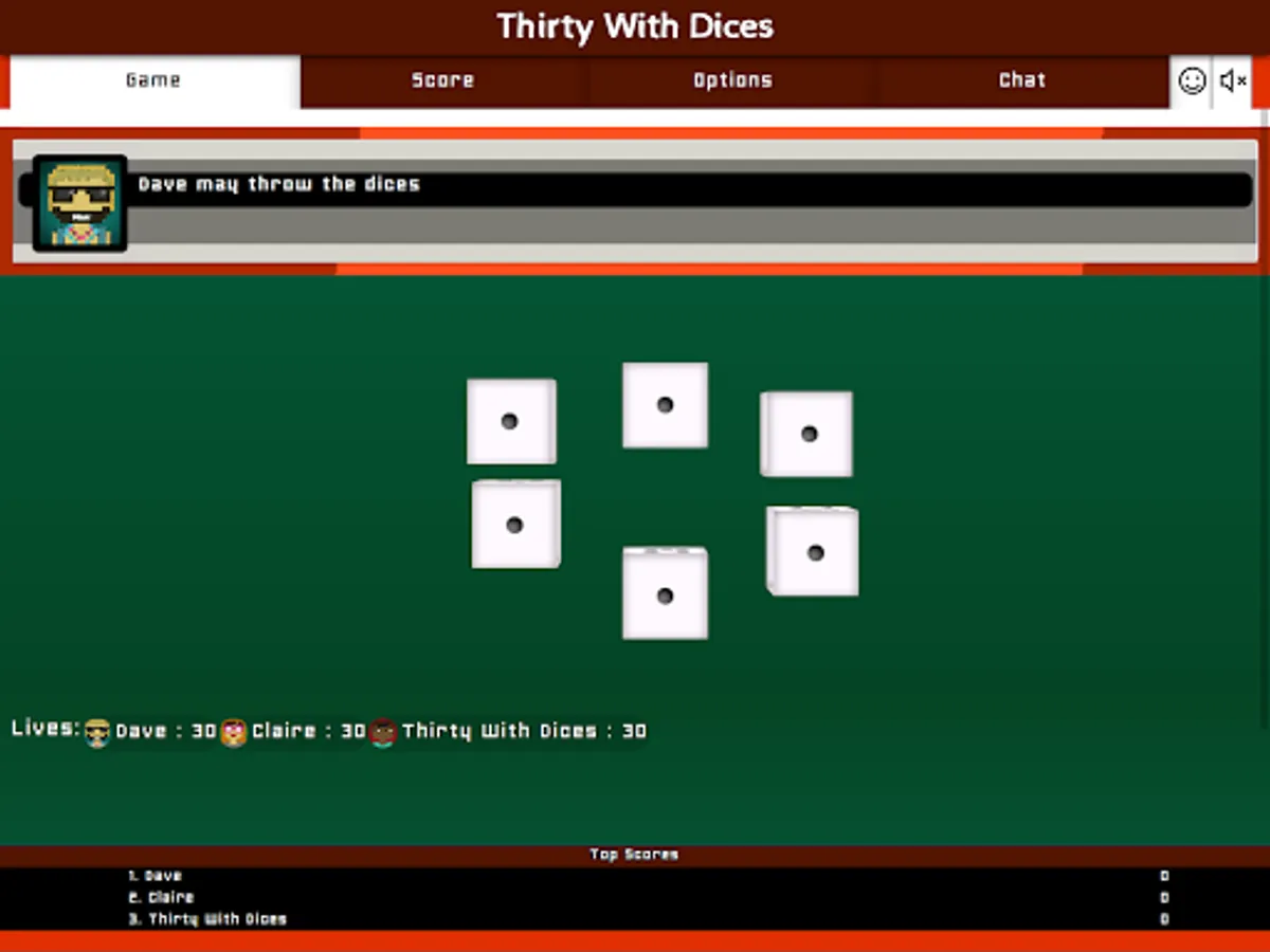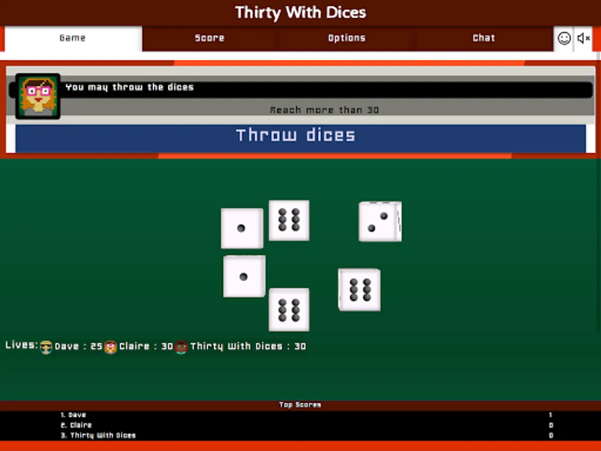 You play this game by throwing 6 dices and reach a total of 30. Every time you throw, you must hold at least one dice that will add up to your total. When all dices have been hold, you can end your turn. If your dice total is below 30, you lose the amount of lives under 30. E.g. if with a total of 27, you'll lose (30-27 =) 3 lives.