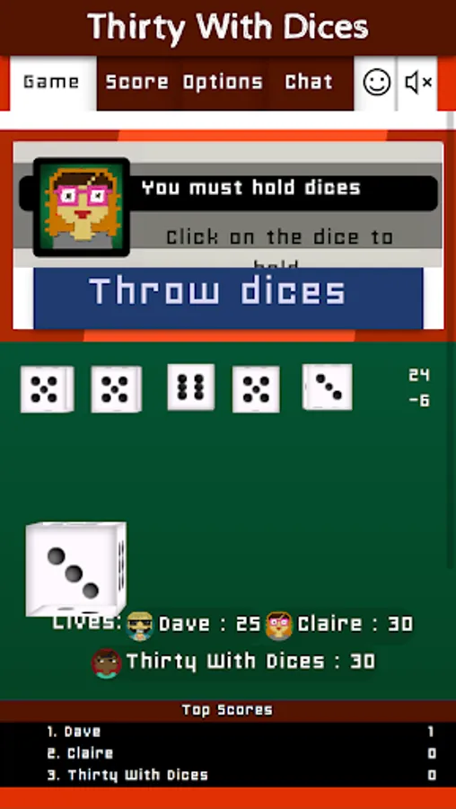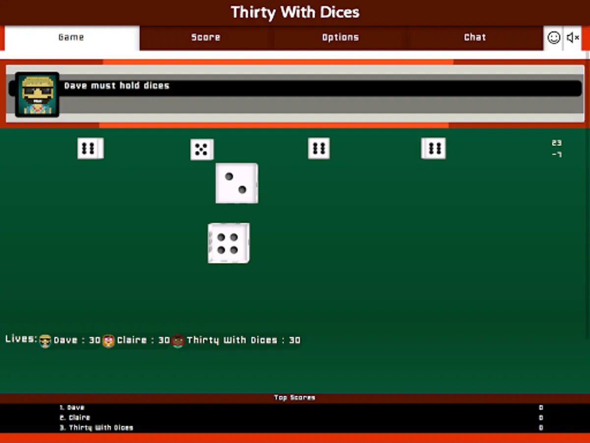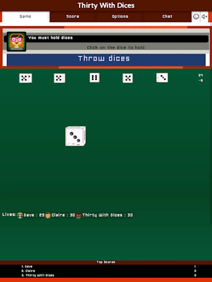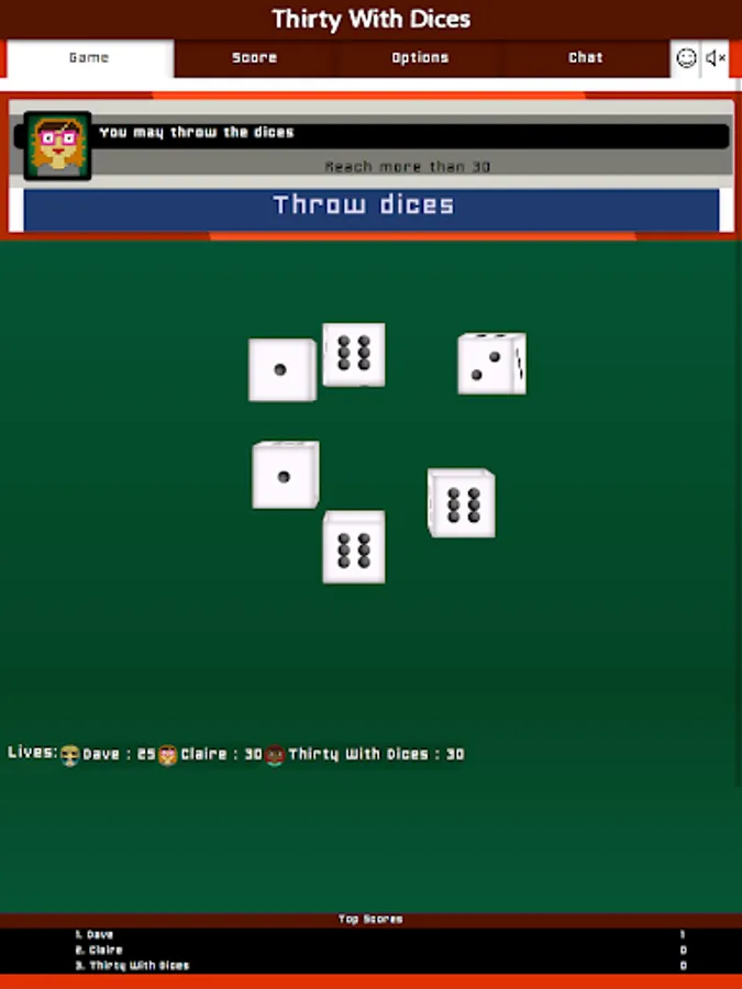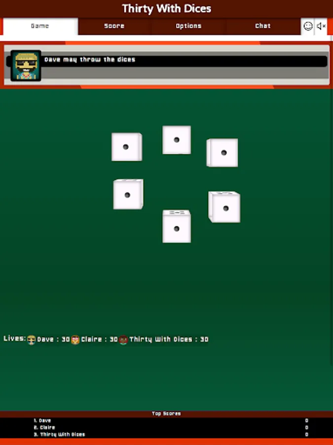 You play this game by throwing 6 dices and reach a total of 30. Every time you throw, you must hold at least one dice that will add up to your total. When all dices have been hold, you can end your turn. If your dice total is below 30, you lose the amount of lives under 30. E.g. if with a total of 27, you'll lose (30-27 =) 3 lives.