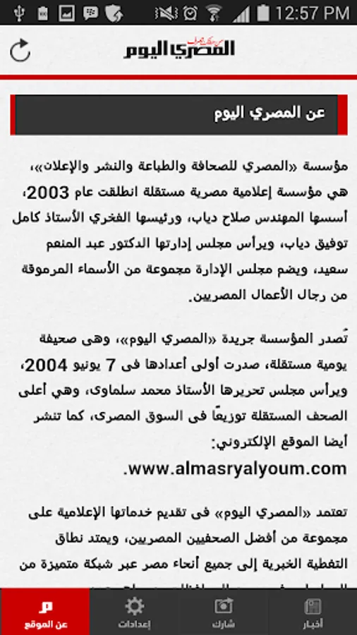 The institution issues Al-Masry Al-Youm, an independent daily newspaper that was launched on 6 July 2004 to become today the first independent newspaper in terms of distribution. The paper is also available electronically on www.almasryalyoum.com