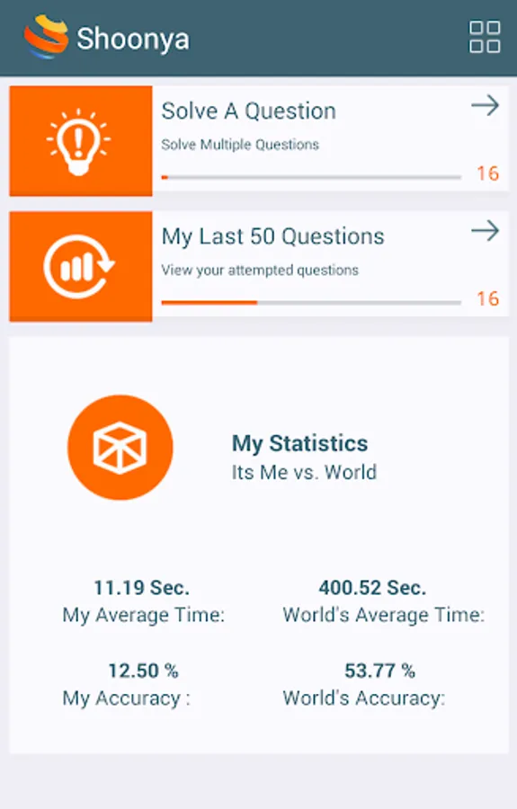 Shoonya has unlimited questions to solve, with constant comparison of your speed and accuracy along with whole world..