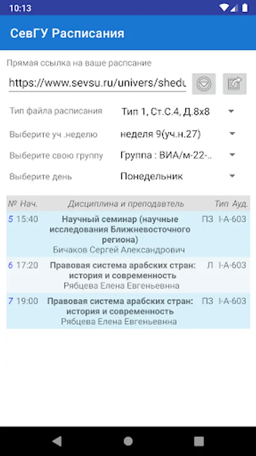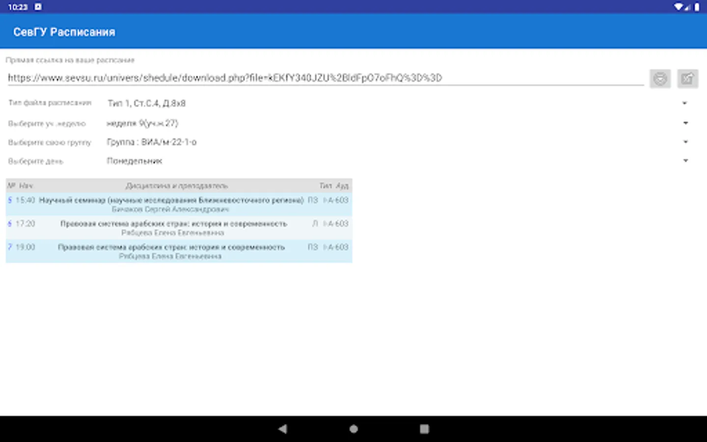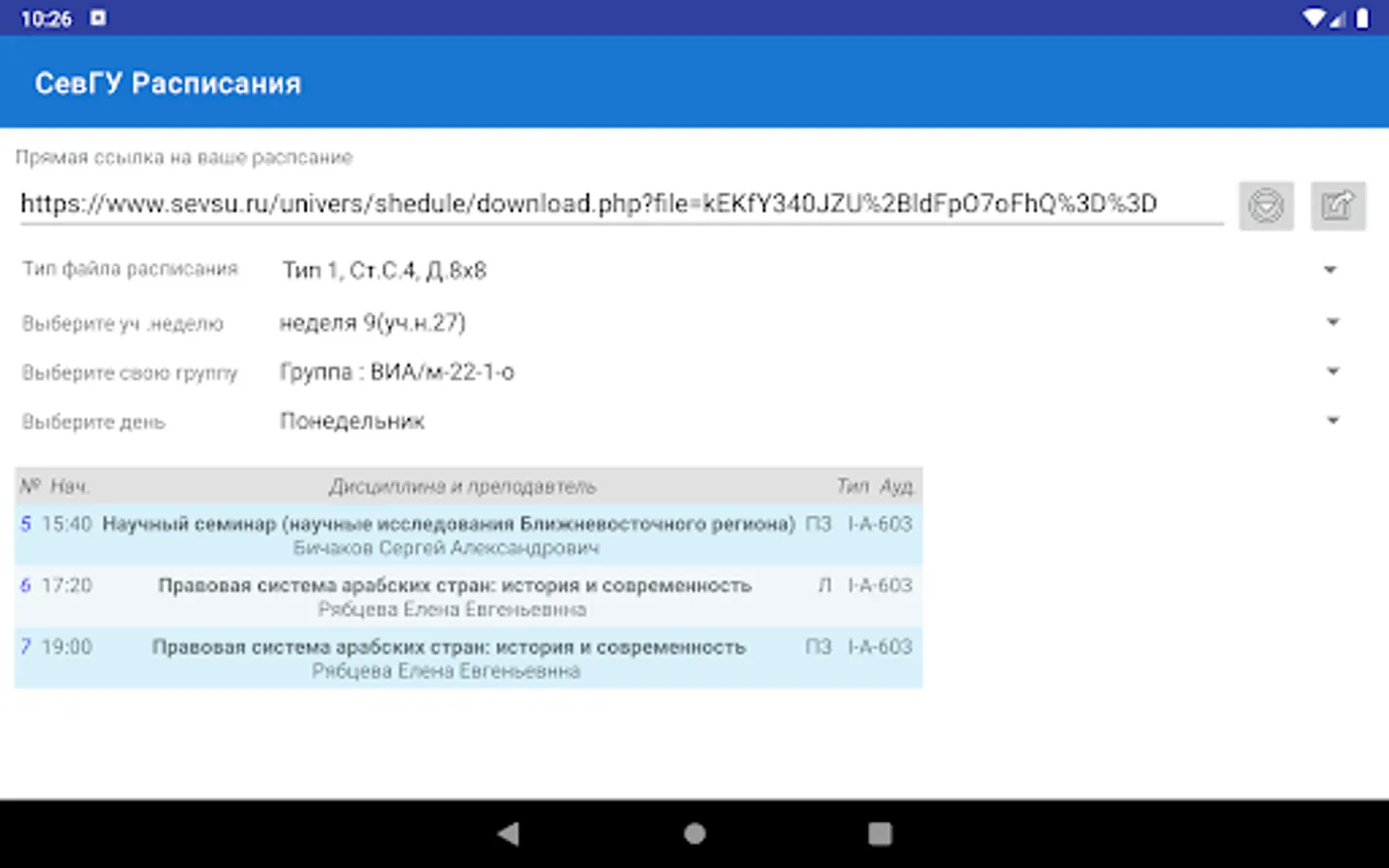 This is not an official parser application for Excel files of timetables downloaded from the university website. The application is able to download the schedule file from the link you specified, parse it according to the wired rules, and show you the schedule of your group on the right day. If the schedule file has been downloaded at least once, then you can continue to use it without the Internet. It is possible to download the schedule again by clicking on a special button (for example, if you have a suspicion that the schedule is out of date).