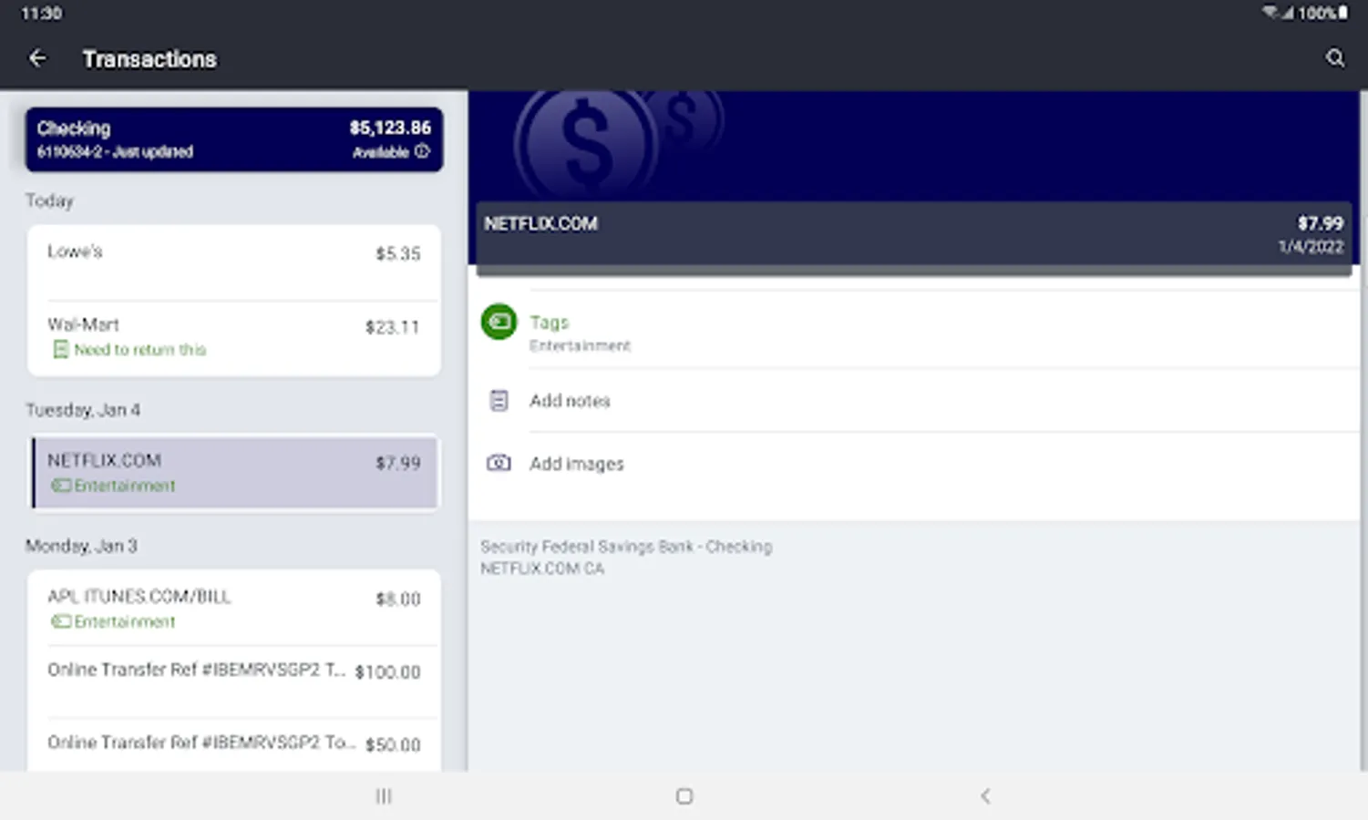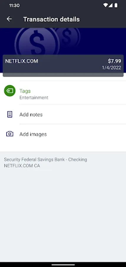 Add Tags, Notes, Images & Geo-Information: By enhancing transactions with custom tags, notes or photos of a receipt or check, you have the ability to stay organized and find exactly what you’re looking for when searching through your finances.