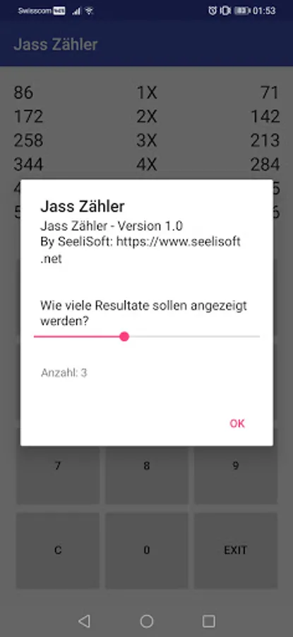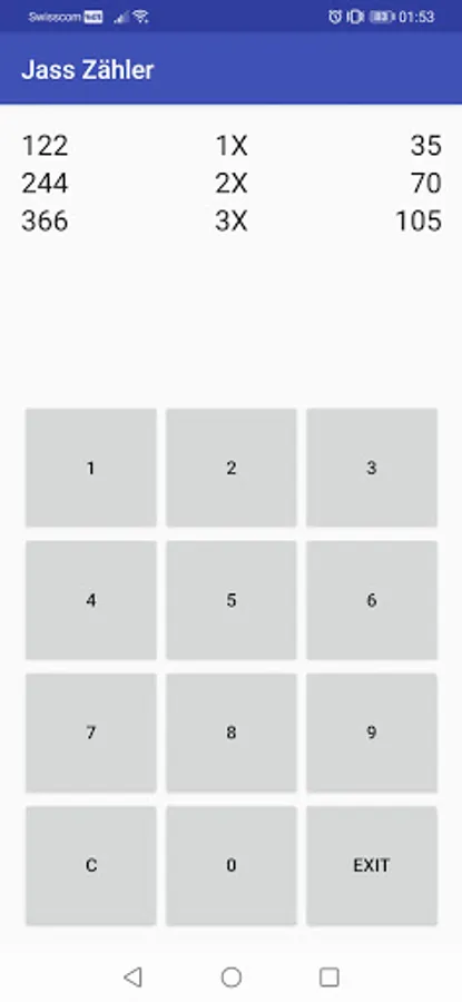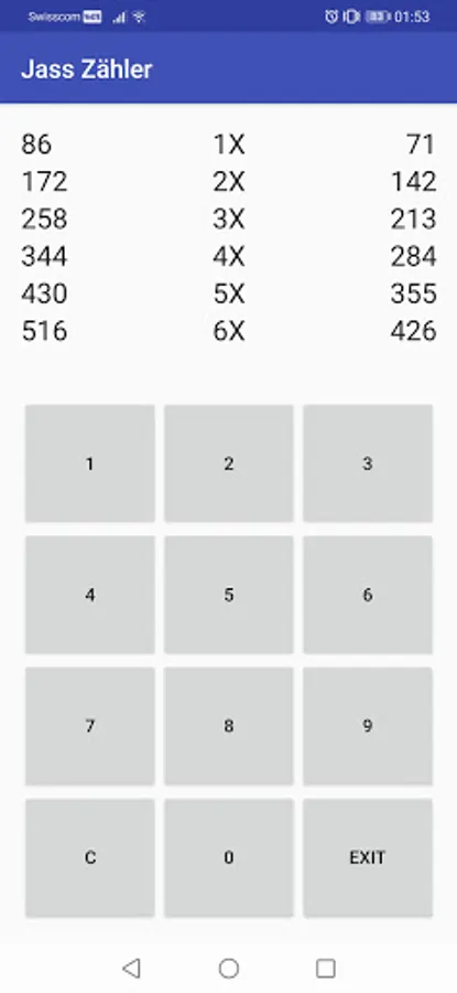 A simple counter for Jassen. The sums for either 1x - 6x can be calculated. When entering a result, the opponent's result is calculated automatically.