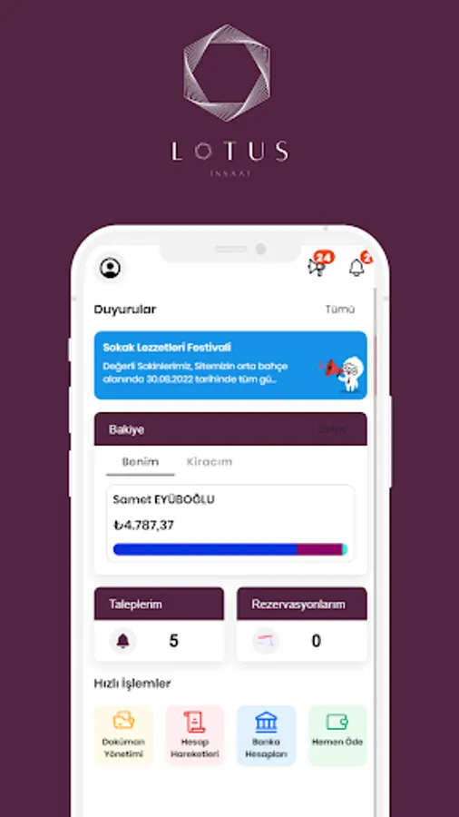 • Online Payment; Dues, Heating, Investment, Hot water etc. Viewing the amounts related to expense items such as and making your payments easily with your own Site Management Account,
