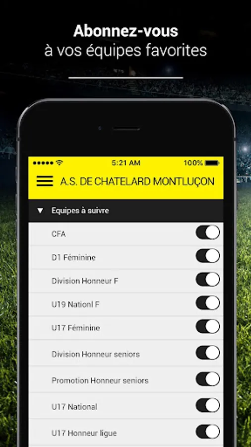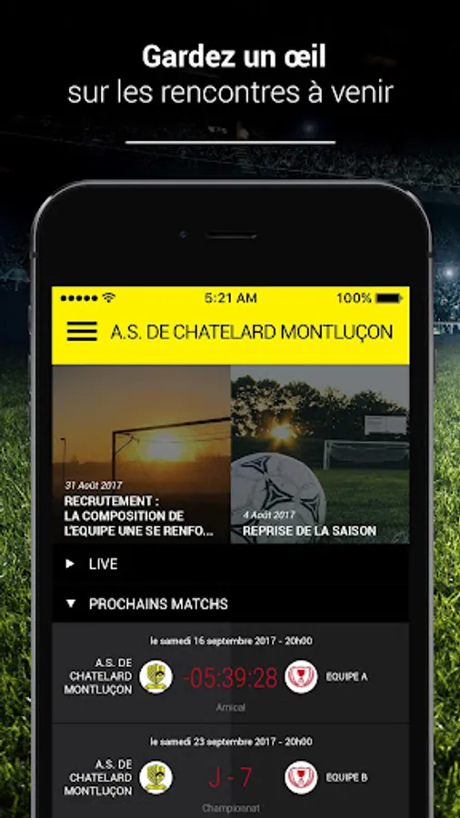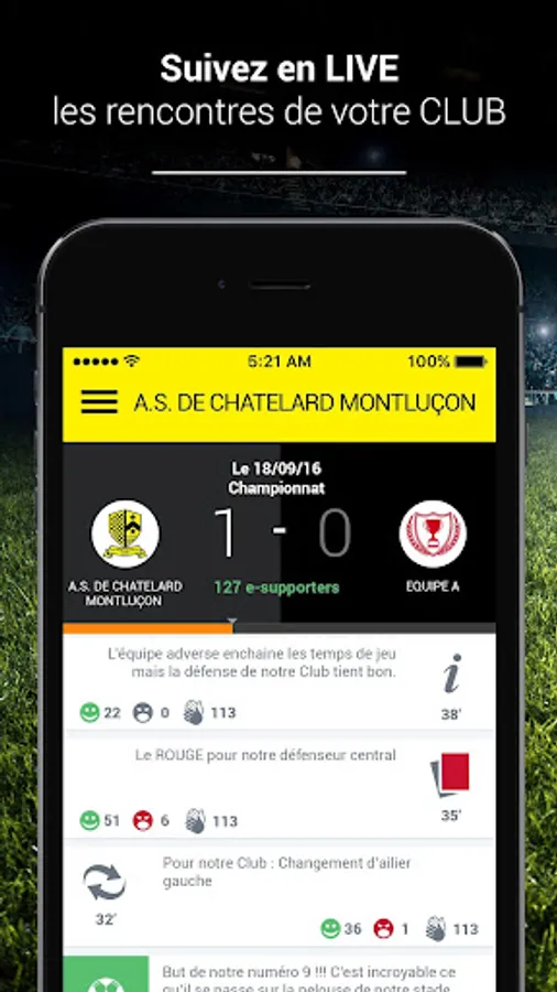 The implementation A.S. CHATELARD OF MONTLUCON lets you follow all the news of your favorite club. You can subscribe to your favorite teams (team 1, junior, U18, female, ...) and live track every sporting event subject to a Live. To you support your club: the application allows you to interact with the team to cheer or hiss sequences of play.