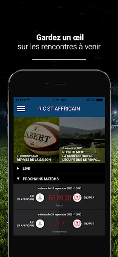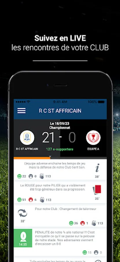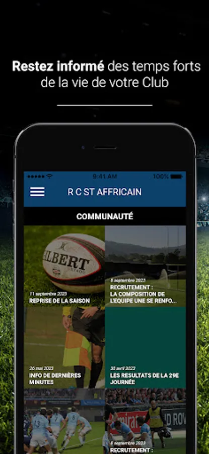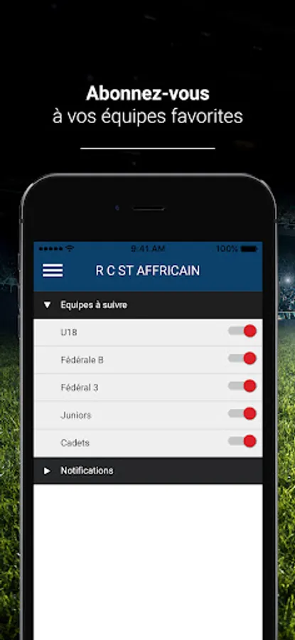 The R C ST AFRICAN application allows you to follow all the news of your favorite Club. You will be able to subscribe to your favorite teams (team 1, cadet, U18, women, etc.) and follow each sporting match live which is the subject of a Live. It's up to you to support your Club: the application allows you to interact with the team to encourage them or to whistle game sequences.