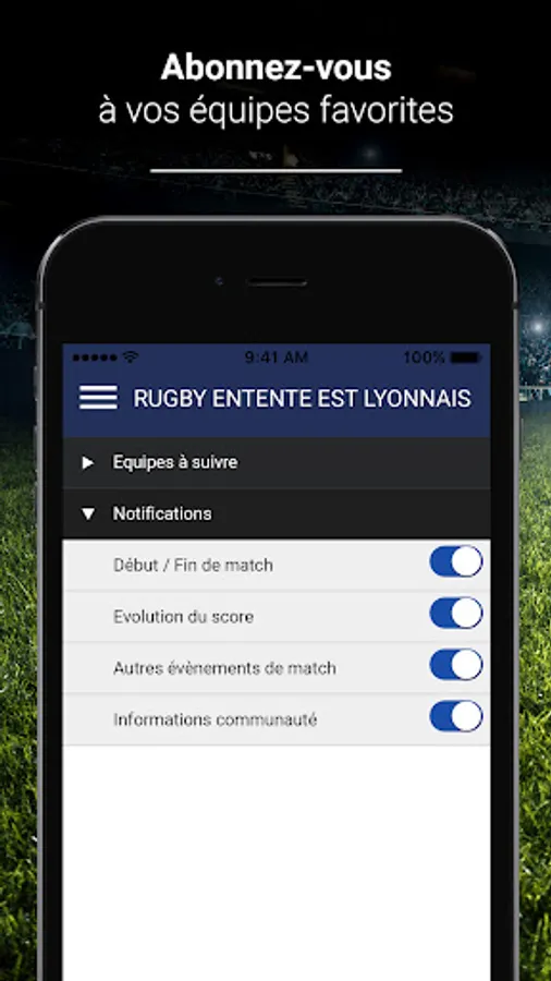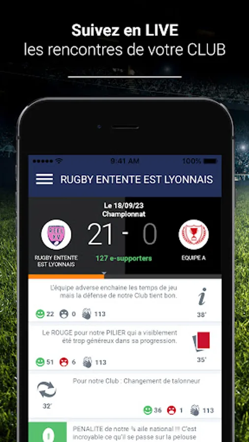 The FC SMARVES ITEUIL application allows you to follow all the news of your favorite Club. You can subscribe to your favorite teams (team 1, cadet, U18, female, etc.) and follow each sporting event live. It's up to you to support your Club: the application allows you to interact with the team to encourage them or to whistle game sequences.