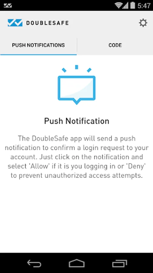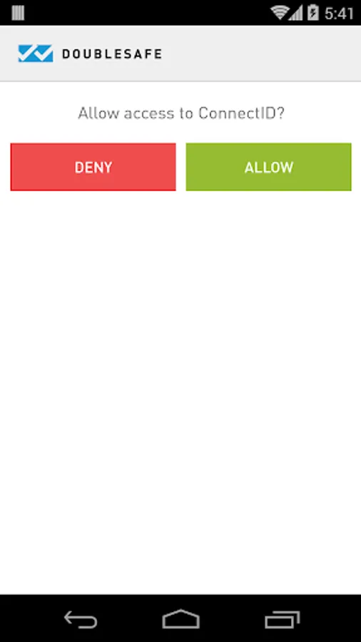 • If you choose to use Push Notifications, the DoubleSafe app will display a message asking you to ‘Allow’ or ‘Deny’ access to your user account. Confirm it is you logging in by selecting ‘Allow’.