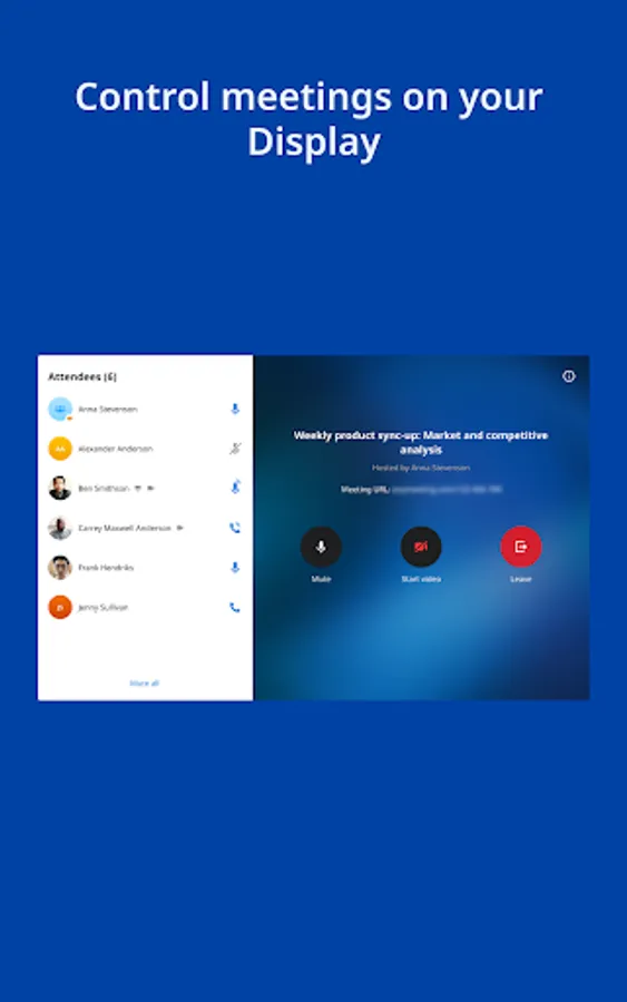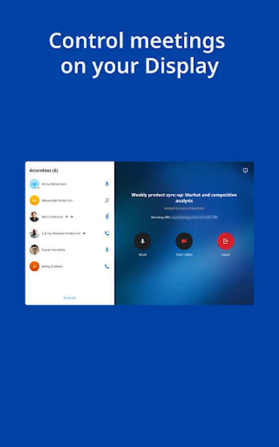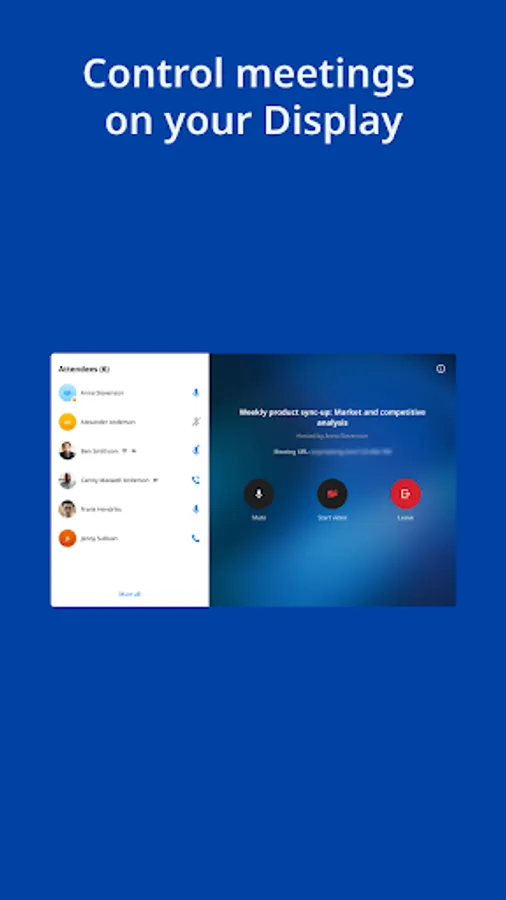 • Control meetings running on your Elevate Rooms Display – share video, mute/unmute audio, leave or end meetings, and much more