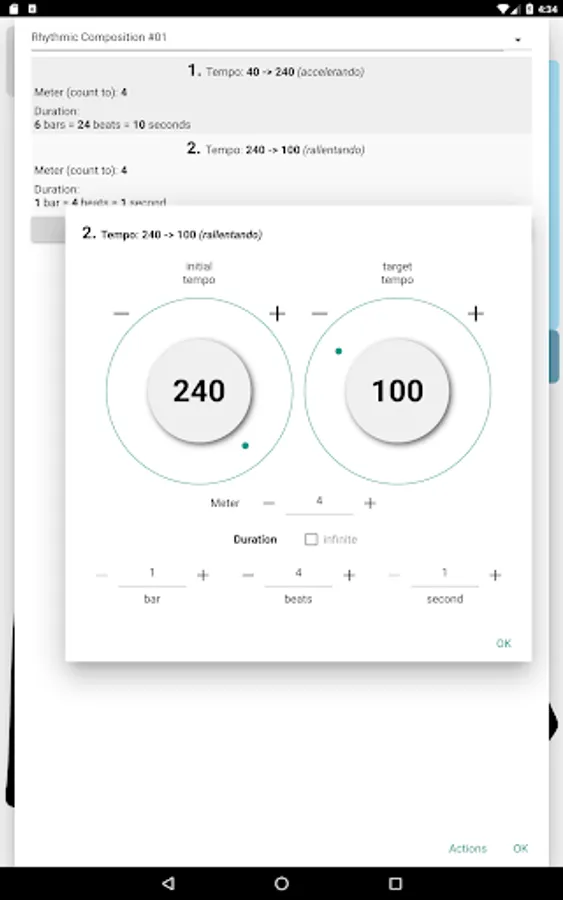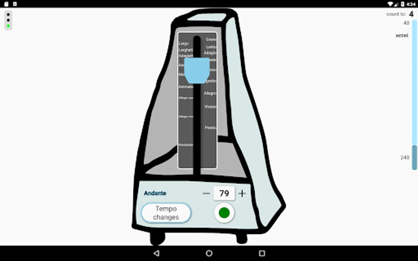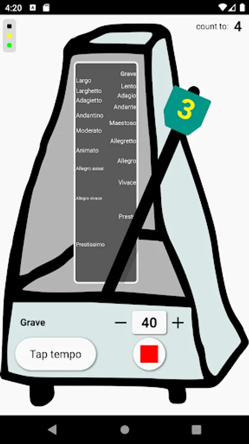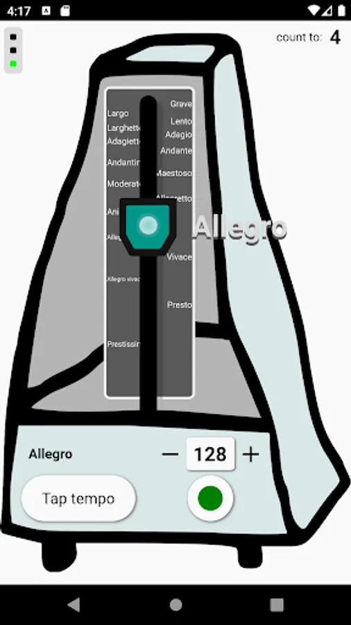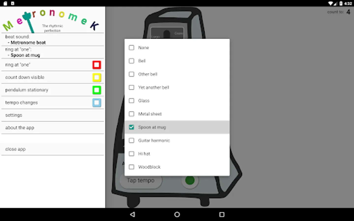 - selectable beat and ring sounds (i.e.: real metronome, clapping, snapping, etc.)