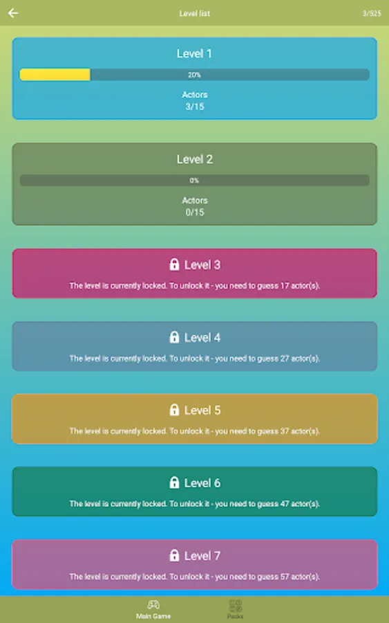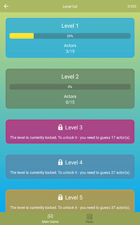In addition to the main levels, the application has 12 packages with questions. Among them: Hollywood actors in childhood, Directors, Old Hollywood actors and actresses, Indian actors.