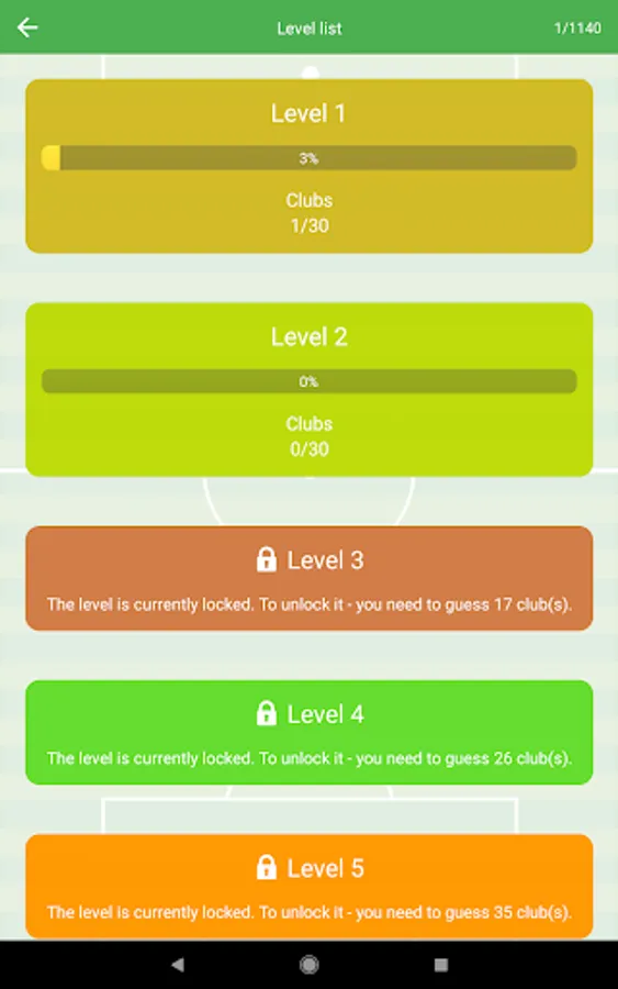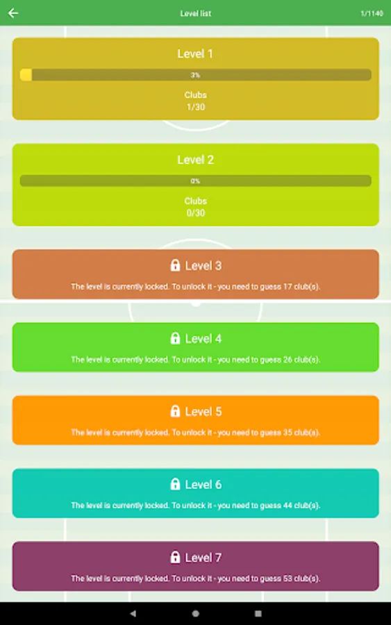 ⚽ Statistics of the progress in the quiz. Solve everything and complete the game at 100%!