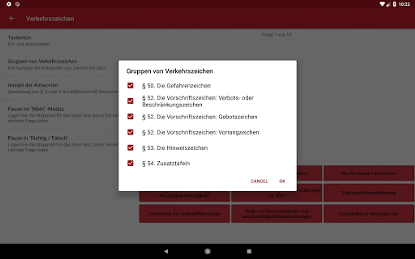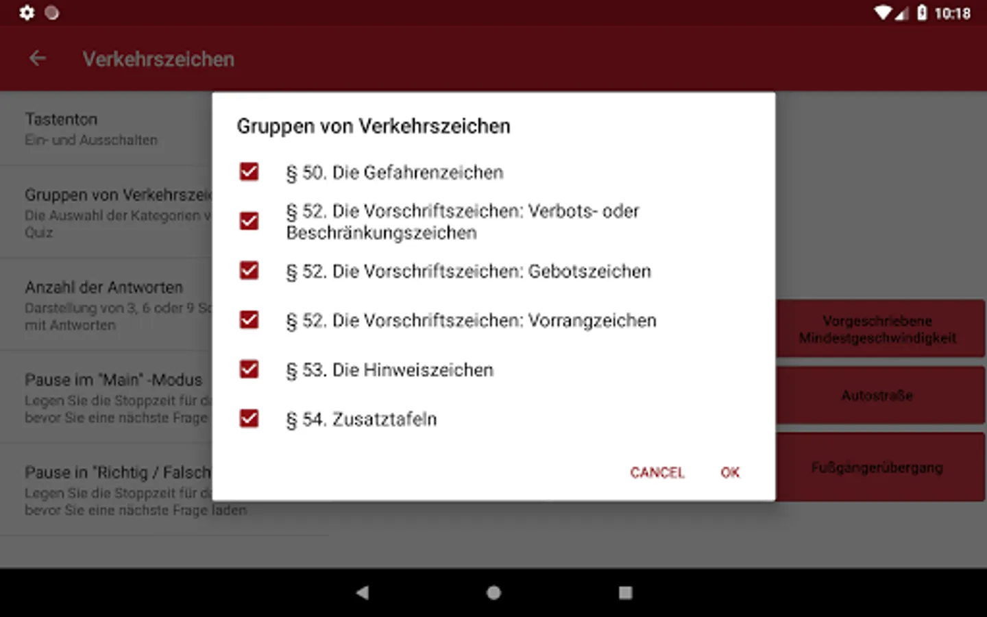 * The category selection of the traffic signs. In the settings you can choose the specific group of traffic signs to train and learn only them;