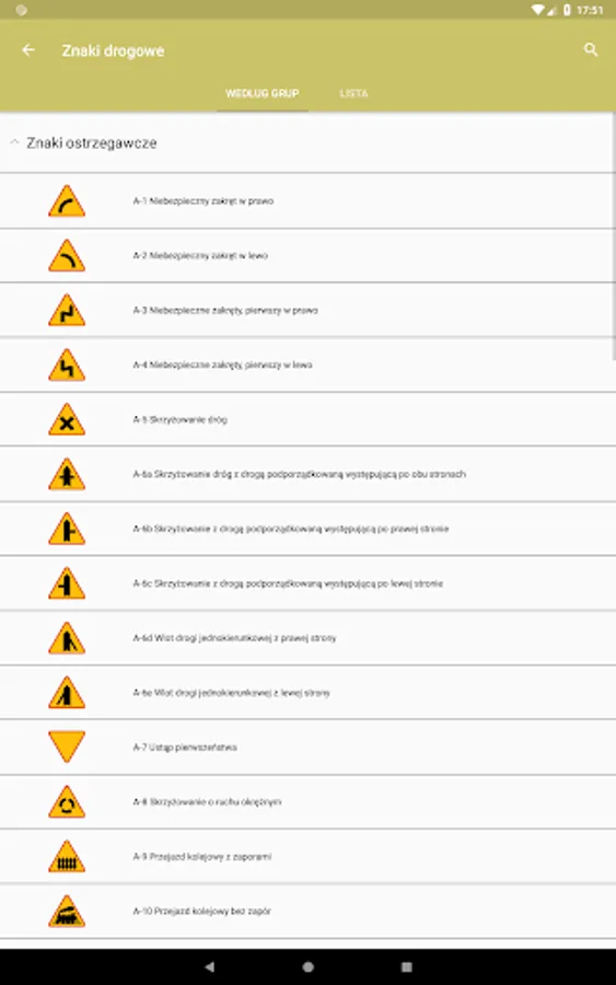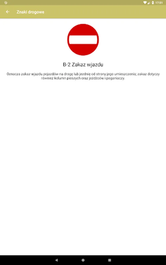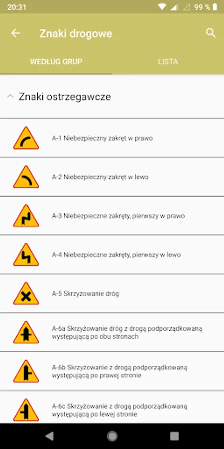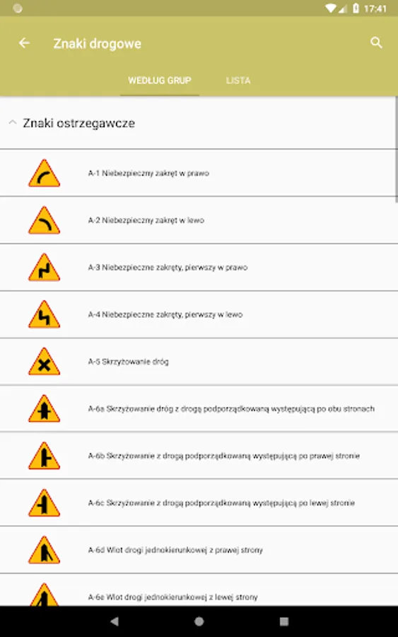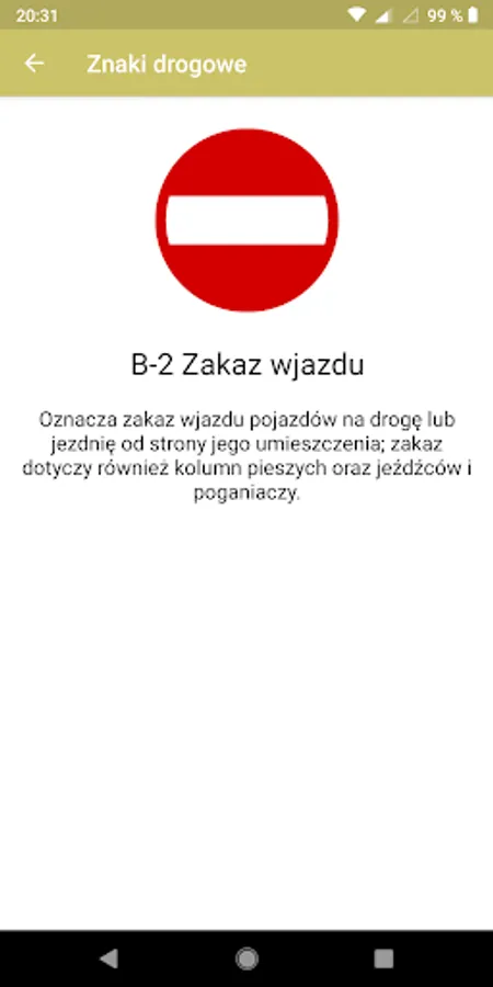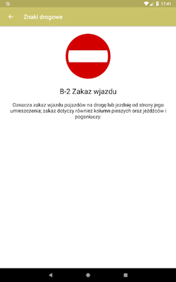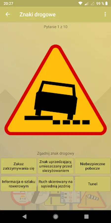 Trainer-quiz for learning road signs in Poland. This mobile application will help you learn or refresh knowledge about all road signs in the form of a game, and will be useful to a wide range of users - from driving school students to specialists with extensive driving experience.