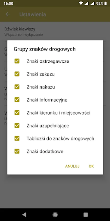 • Selection of traffic sign categories for training. You can select individual groups of road signs that you know less than or that you want to train at the moment.